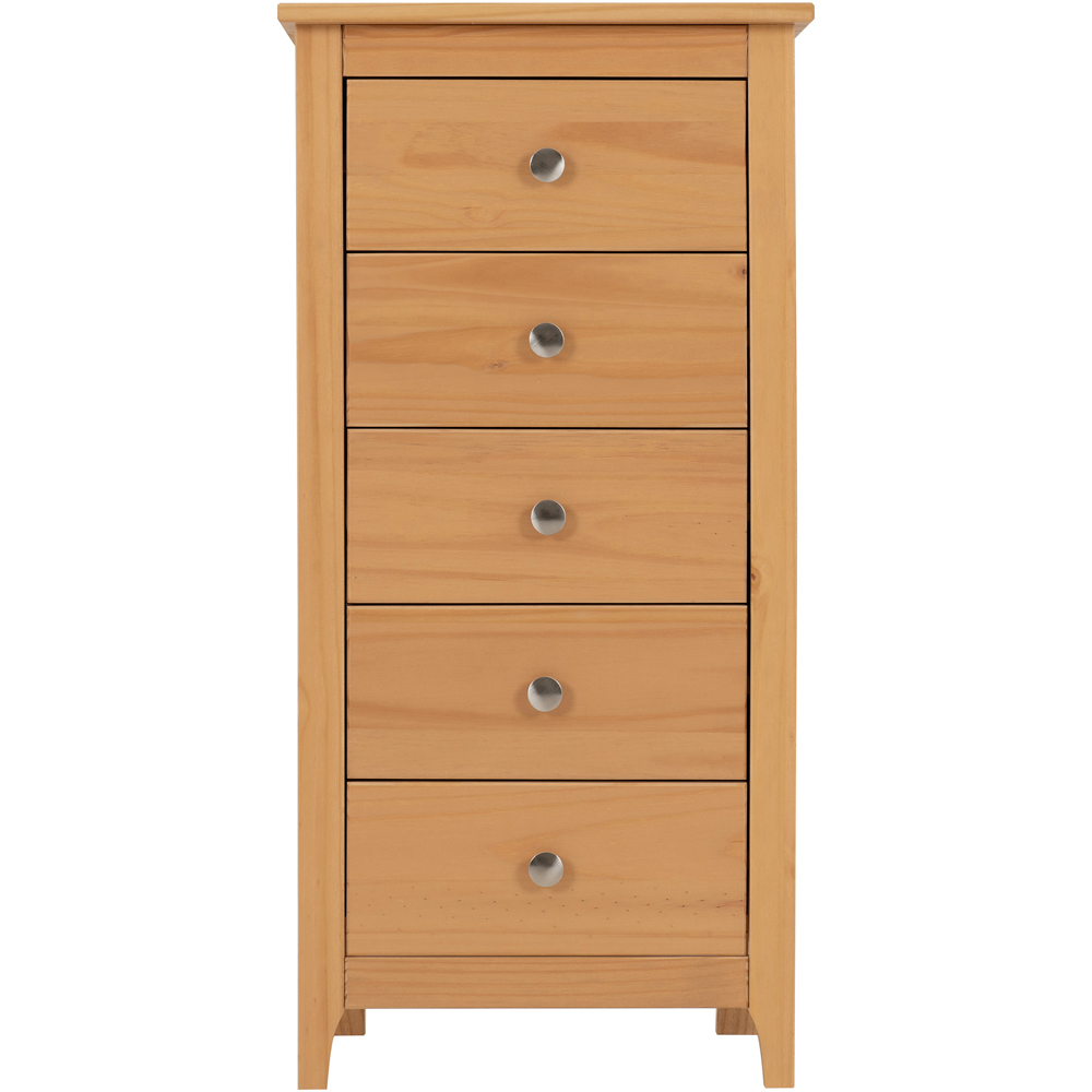 Elevate your space with the timeless appeal of the Oslo 5-Drawer Narrow Chest. Its simple yet sophisticated antique pine design, adorned with sleek silver hardware, embodies rustic charm while exuding an air of refinement. This chest offers ample storage within its five spacious drawers, ensuring your essentials stay organised. Effortless assembly, thanks to its flat-pack convenience, makes it a hassle-free addition to any room.