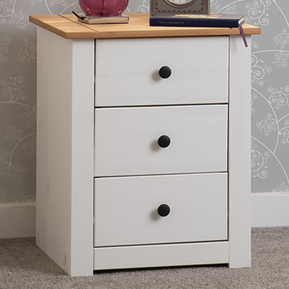 Make space for your nighttime essentials with this Seconique Panama 3 Drawer White and Natural Wax Bedside Table, a stylish and practical addition to your bedroom. With a classic design, this solid pine wood bedside table features a combination of a white frame and a natural wax finish on the drawers. The table includes three drawers, offering convenient storage for your night-time essentials such as books, glasses, or personal items.
