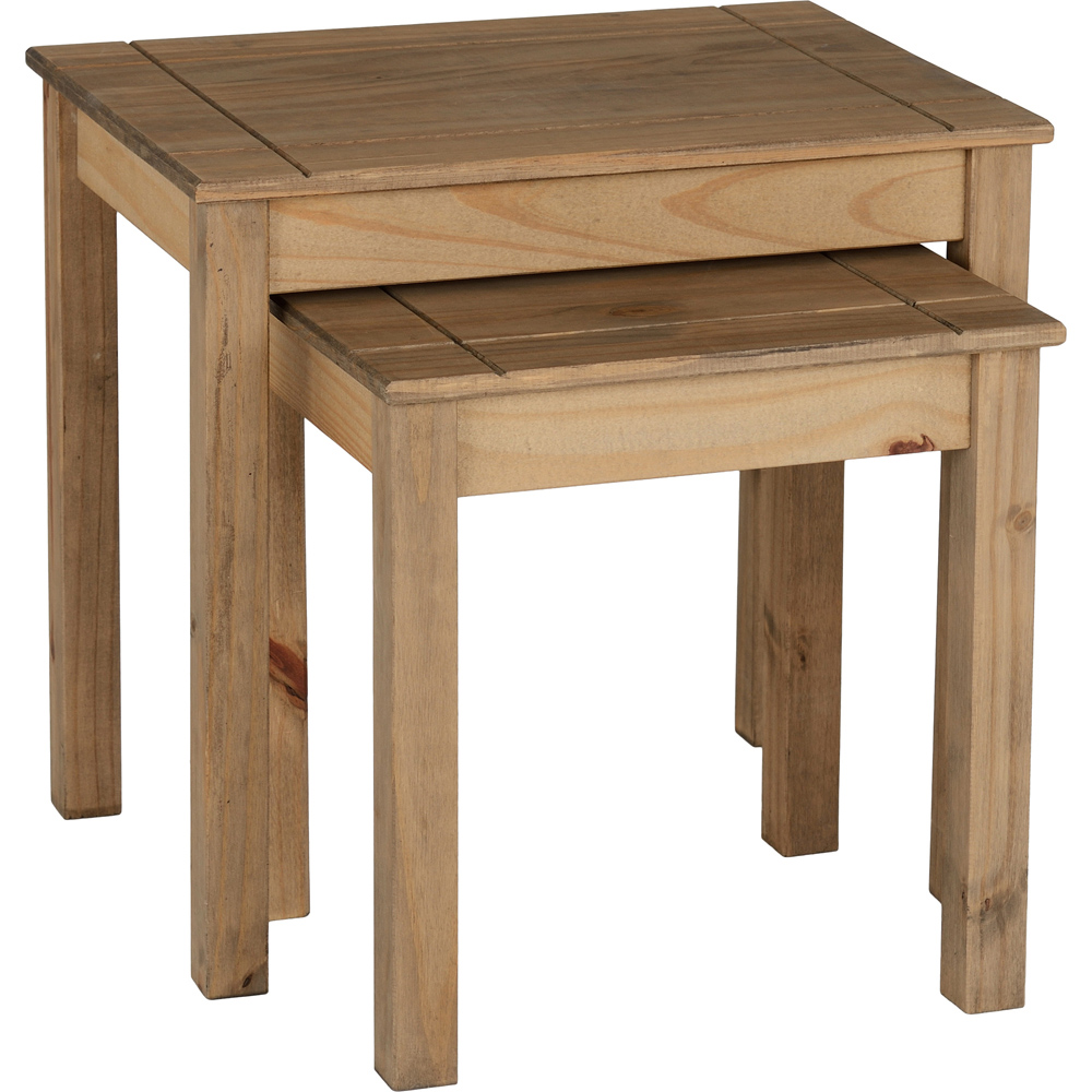 Make a practical and stylish addition to your space with the Seconique Panama Natural Wax Nest of Tables Set of 2. These tables make a practical and space-saving addition to your living room. With a classic design, this set includes two tables of different sizes that can be nested together when not in use. Also, the tables feature a natural wax finish that highlights the wood's natural beauty, adding a warm and rustic touch to your living space. Plus, space-saving, you can simply slide the smaller table under the larger table when not in use. Set of 2.