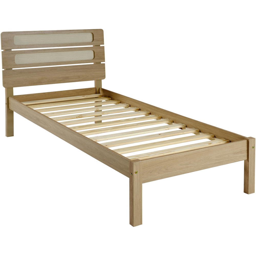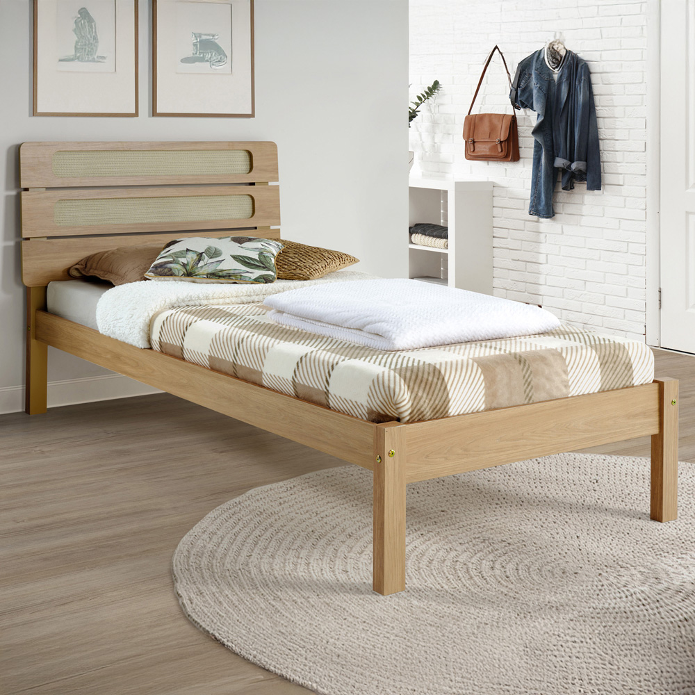 Discover the perfect harmony of style and simplicity with our Santana Single Bedframe. Crafted in a rattan-inspired design, this bedframe exudes a natural allure, while its simple light oak colour adds a touch of modern elegance to any bedroom. Embracing a minimalist approach, the Santana Bedframe blends seamlessly with various interior styles, offering both charm and versatility. Designed for convenience, it comes in a flat pack, ensuring easy assembly without compromising on its sturdy build.