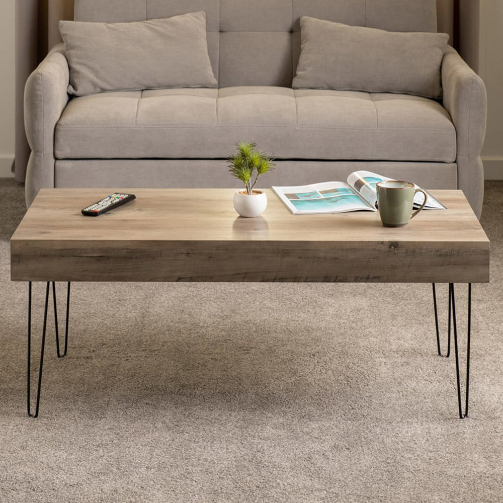 Upgrade your dining area with the Seconique Troy Coffee Table. It is a stylish and practical addition to your living space. This rectangular coffee table complements all types of interior spaces. Featuring a modern design, this coffee table is finished in medium oak effect for a warm and natural look. The black metal legs and detailing add a contemporary touch, creating a visually appealing contrast.