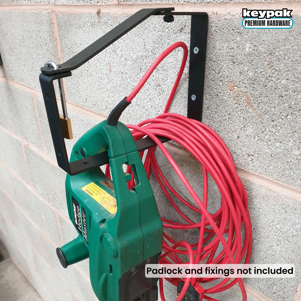 For the safe, convenient and secure storage of ladders, power tools and bikes with a padlock. Can be mounted on walls or ceiling (mounting holes on all 3 sides of the ladder hooks).