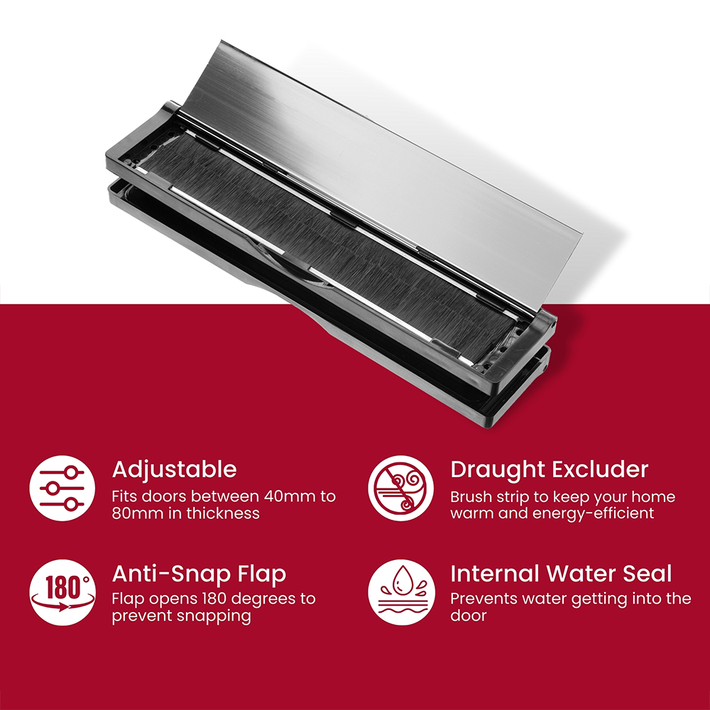 Enhance your door's functionality with this internal draught excluder letterbox. Featuring integrated brushes to block draughts and an internal water seal to prevent leaks, it ensures your home stays comfortable and dry. The anti-snap flap opens a full 180 degrees, allowing easy access and reducing the risk of damage. With an adjustable sleeve, this letterbox fits doors 20mm to 39mm thick, making it suitable for most uPVC, composite, and timber doors. The 12-inch length ensures a perfect fit for your needs.