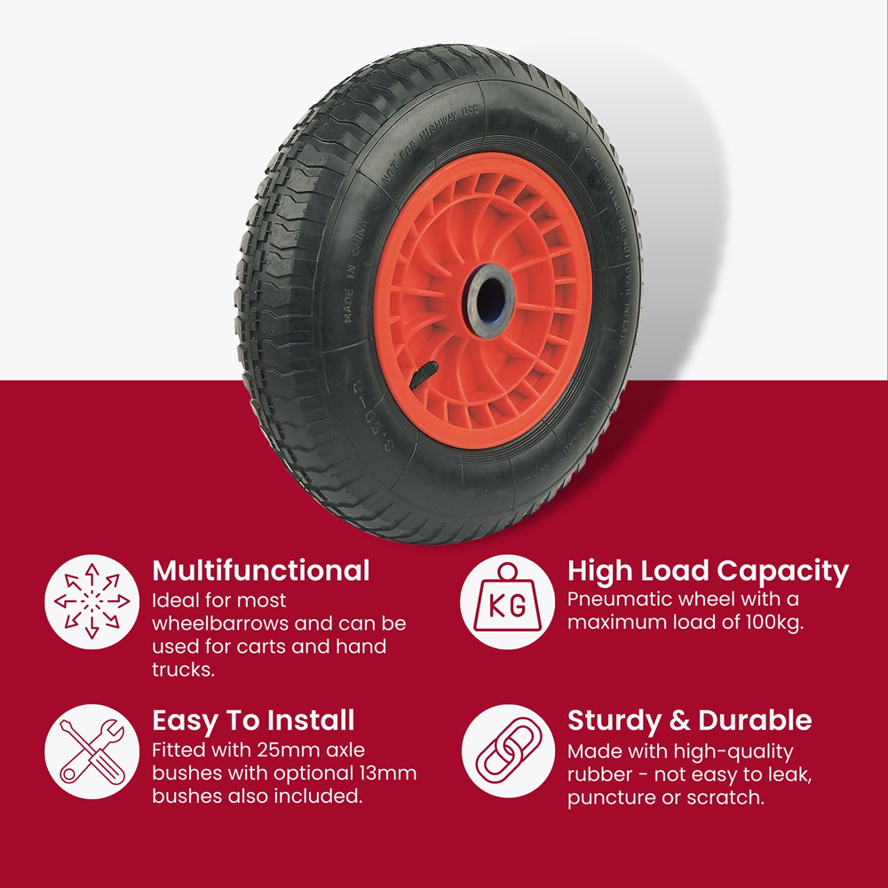 14-inch Pneumatic Wheelbarrow Wheel, 25 and 13mm Bore, Red Plastic Hub.