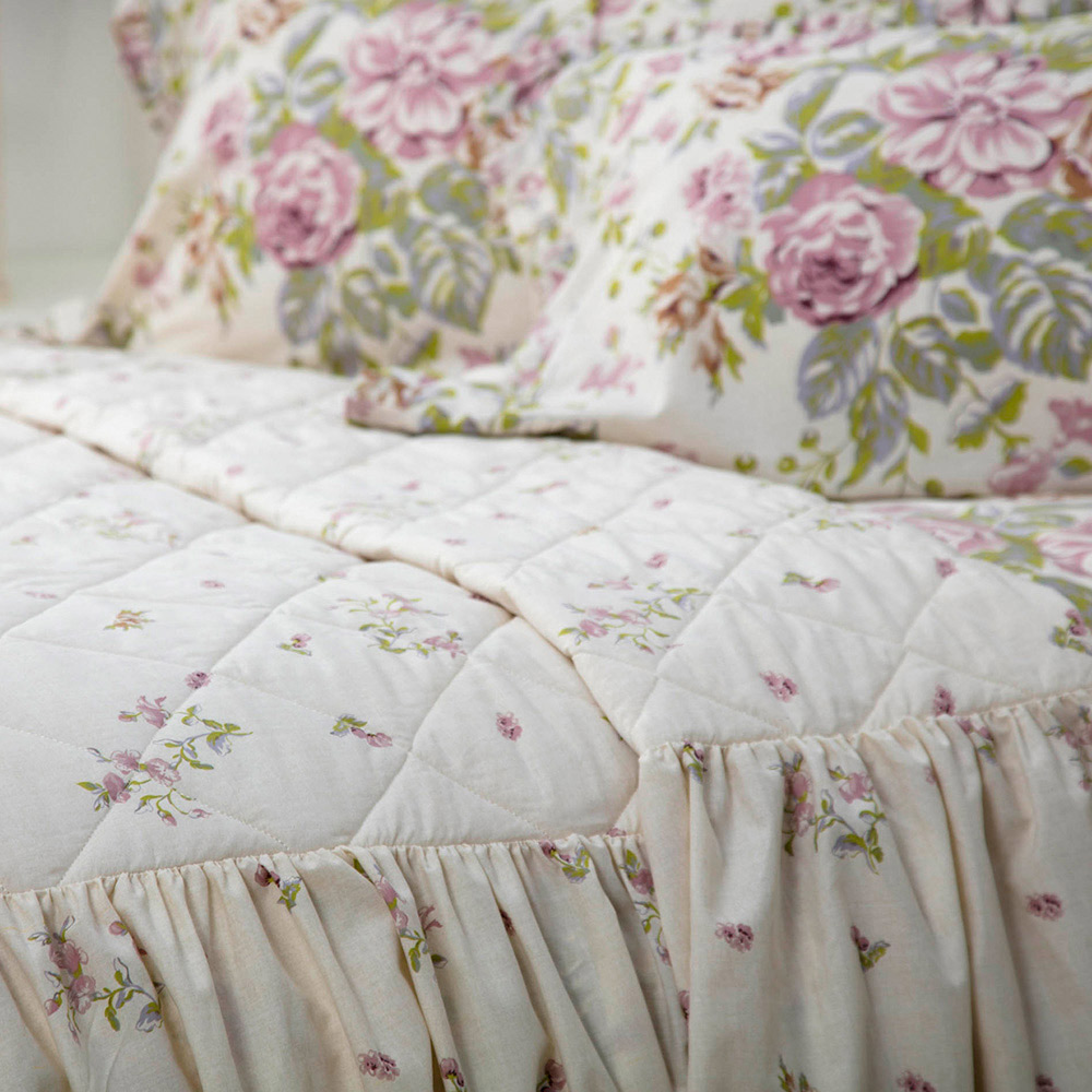 The Serene Country Dream Rose Boutique Bedspread features large pretty blooms in warm shades of pink and dainty floral sprigs as a coordinating reverse. This design is printed on a textured background in a warm shade of ivory and styled with a smart box pleat frill. Plus, the attention to detail adds to the charm of this design. Size: Double, 142 x 196cm. Material: 50% Combed Cotton and 50% Polyester. Care and use: Machine washable at 40C. Do not bleach. Do not dry clean. Tumble dry or drip dry. Use a warm iron. Wash colours separately. Wash before use.