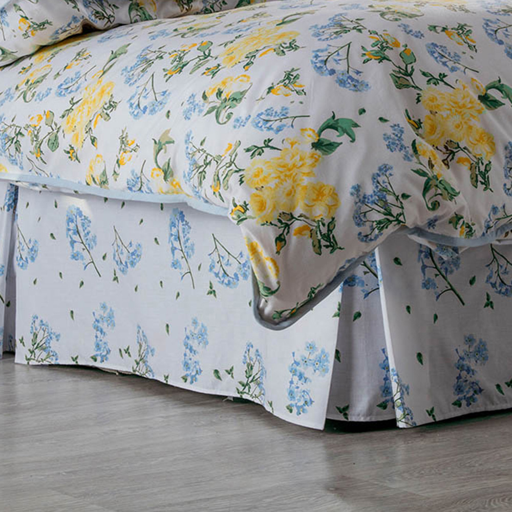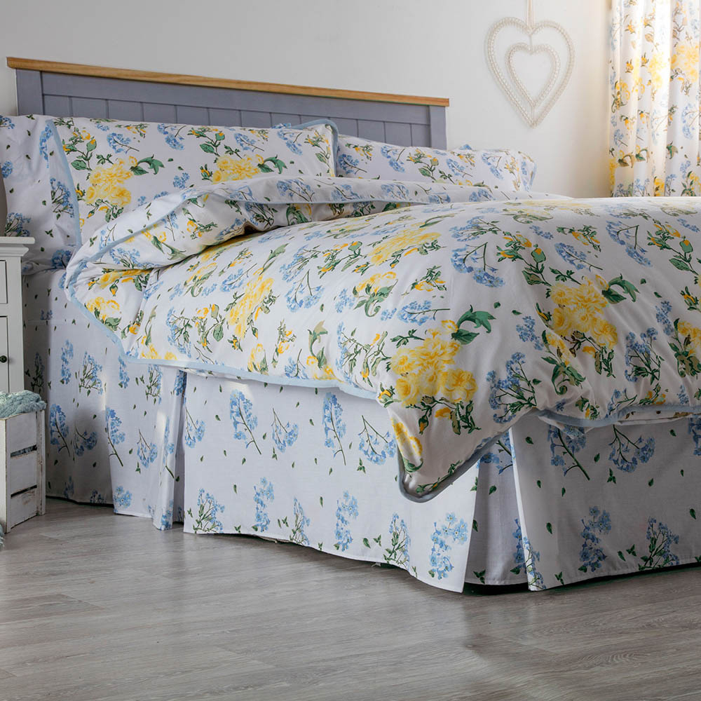 The Serene Country Dream Arabella Fitted Valance in soft shades of blue and lemon on a crisp white background will create a fresh and pretty feel to your bedroom. The lovely floral design has been stylishly trimmed with soft blue piping to complement any decor theme. Size: King, 152 x 198cm. Material: 50% Combed Cotton and 50% Polyester. Care and use: Machine washable at 40C. Do not bleach. Do not dry clean. Tumble dry or drip dry. Use a warm iron. Wash colours separately. Wash before use.