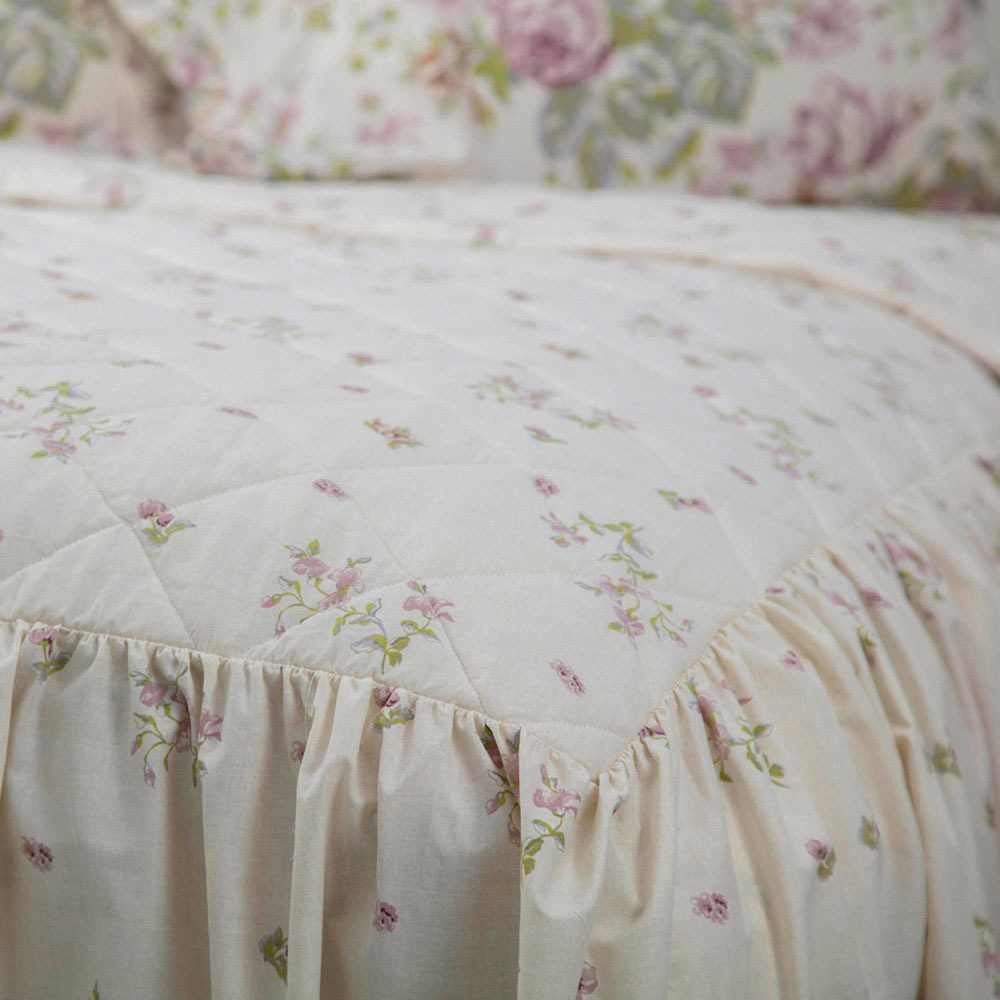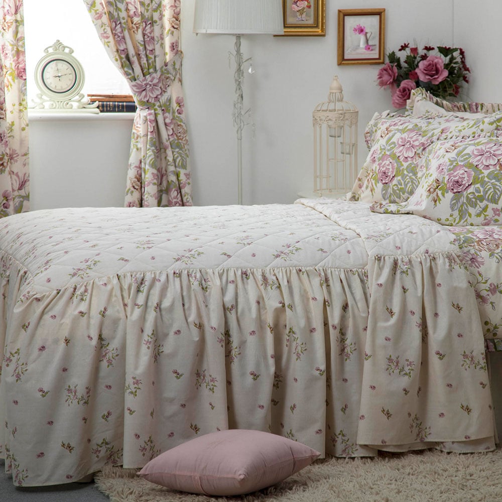The Serene Country Dream Rose Boutique Bedspread features large pretty blooms in warm shades of pink and dainty floral sprigs as a coordinating reverse. This design is printed on a textured background in a warm shade of ivory and styled with a smart box pleat frill. Plus, the attention to detail adds to the charm of this design. Size: Single, 97 x 196cm. Material: 50% Combed Cotton and 50% Polyester. Care and use: Machine washable at 40C. Do not bleach. Do not dry clean. Tumble dry or drip dry. Use a warm iron. Wash colours separately. Wash before use.