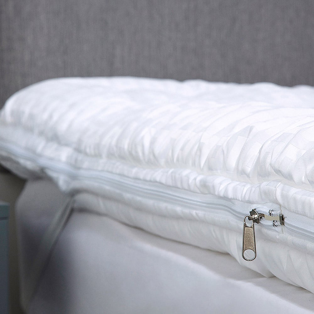 Bring true Hotel luxury to your home with this premium Double Bed Hotel Filled Dual Topper from Serene. The dual-layer topper, with its base layer for support and top layer for comfort, is filled with polyester clusters providing a plump long-lasting filling. Its generous straps keep the topper firmly in place and can stretch over a mattress and base measuring up to 22 inches in depth. Size: 135 x 190cm. Material: 100% Polyester Jacquard Cover, Filling: Polyester Clusters. Care and use: Machine washable at 60C. Do not bleach. Do not dry clean. Tumble dry or drip dry. Do not iron. Wash colours separately.