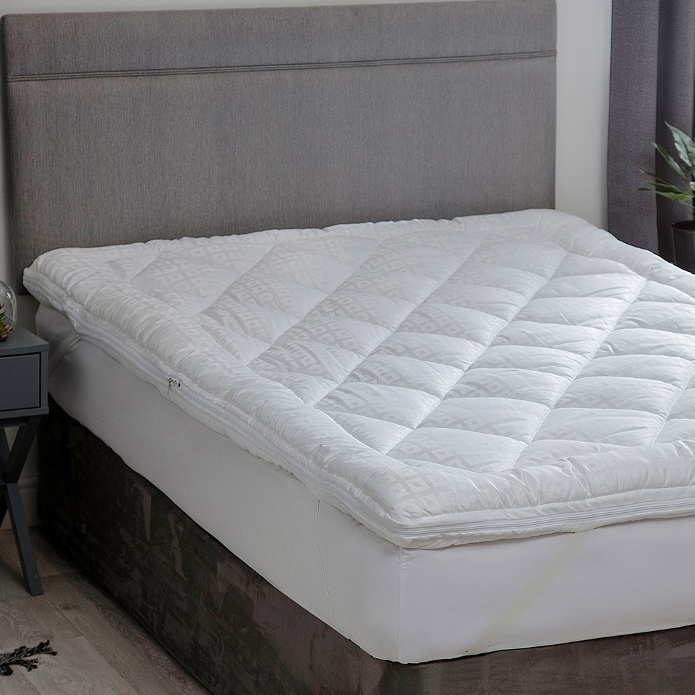 Bring true Hotel luxury to your home with this premium Single Bed Hotel Filled Dual Topper from Serene. The dual-layer topper, with its base layer for support and top layer for comfort, is filled with polyester clusters providing a plump long-lasting filling. Its generous straps keep the topper firmly in place and can stretch over a mattress and base measuring up to 22 inches in depth. Size: 90 x 190cm. Material: 100% Polyester Jacquard Cover, Filling: Polyester Clusters. Care and use: Machine washable at 60C. Do not bleach. Do not dry clean. Tumble dry or drip dry. Do not iron. Wash colours separately.