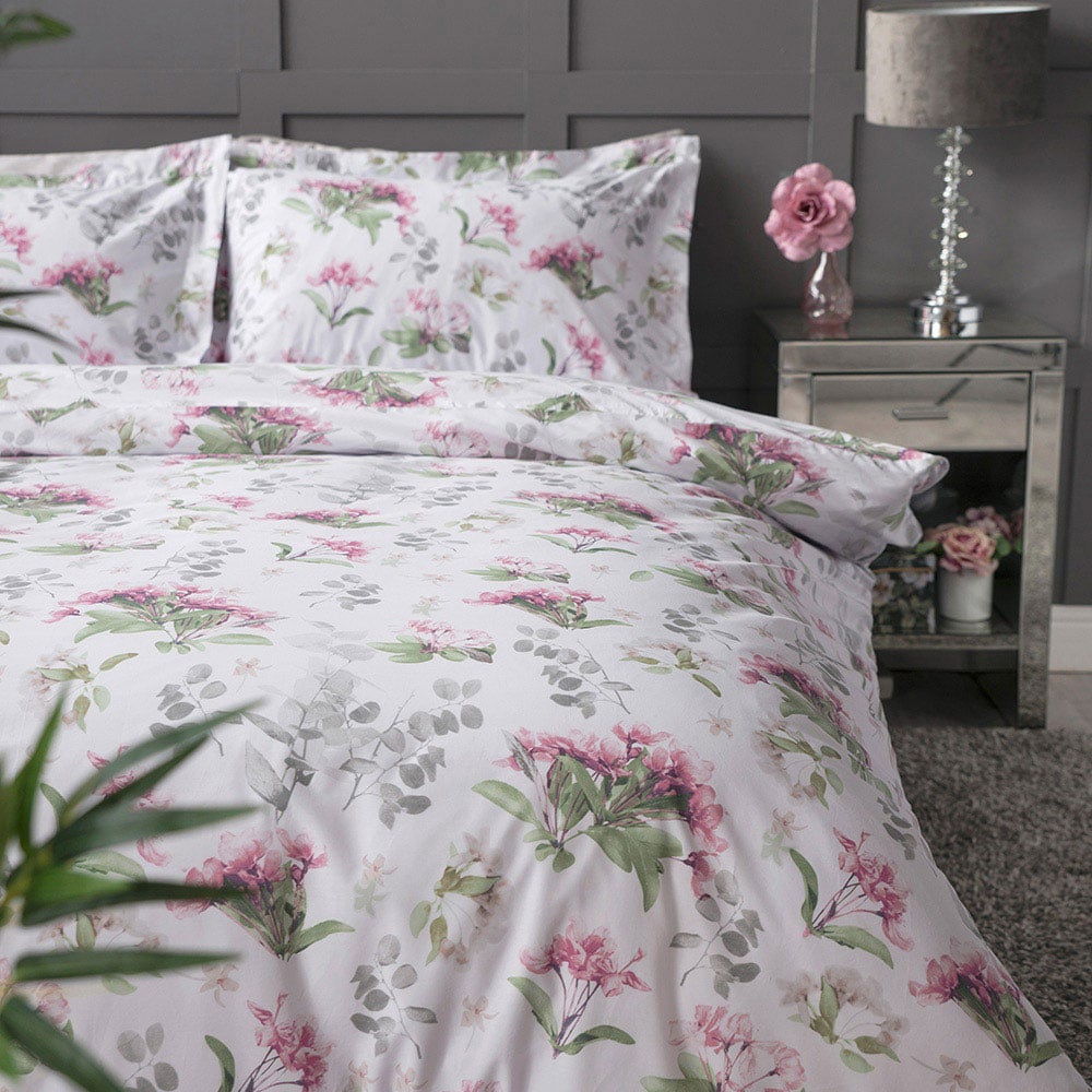 Add a touch of style and comfort to your bed with Serene Super King Size 200 Thread Count Elsbeth Duvet Cover Set. Printed on a crisp white background with flower heads in the prettiest of pink, leaves in the softest of green and touches of grey, Elsbeth is a truly fresh and modern floral. Made from cool 200 thread count 100% pure cotton, the duvet set includes Oxford-style pillowcases to add an extra finishing touch. The hand holes in the corner of the duvet cover make it easier to pull the duvet through into the corners. The set includes one duvet cover and two pillowcases. Material: 100% Cotton. Size: 260 x 220cm. Wash Care: Machine washable at 40C. Do not bleach. Do not dry clean. Tumble dry or drip dry. Use a warm iron. Wash colours separately. Wash before use.