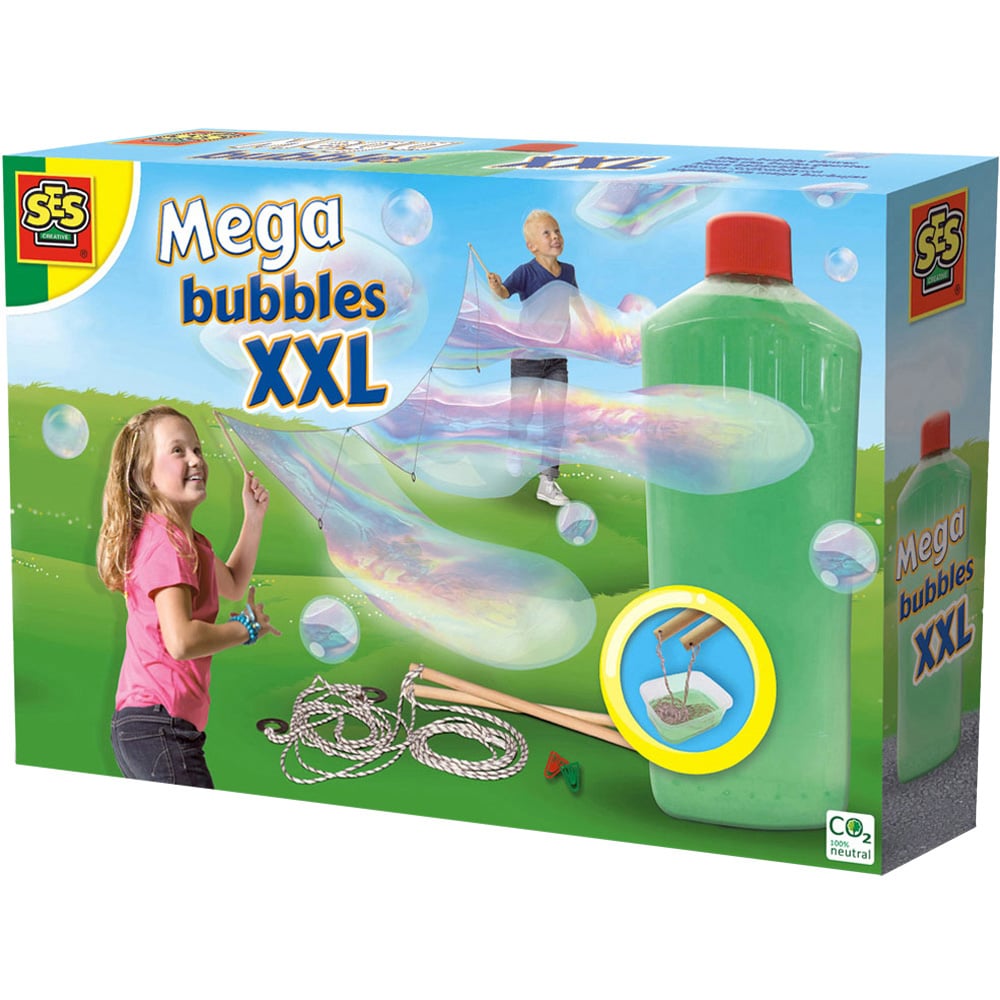 Experience the ultimate bubble fun with the SES Creative Mega Bubbles XXL Play Set. This set features an adjustable bubble frame designed for two people to use together. With the extra-strong CO2-neutral soap solution, you can create huge bubbles up to 1 metre long. Includes a 750ml bottle of soap solution. Ideal for ages five and up.