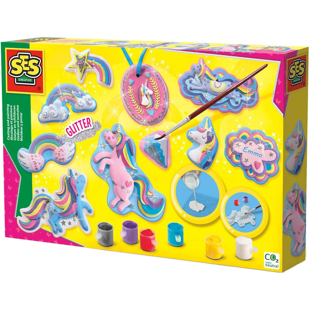 For unicorn lovers, the SES Creative Unicorns Casting and Painting Set offers a magical crafting experience. Pour plaster into the moulds, let it set, and paint the 12 unicorn figurines with the supplied colours. The set includes a plaster pack, mould, six trendy paint colours, a paintbrush, a smoothing tool, a silver glitter tube, and a blue satin ribbon. The paint and plaster are easily washable.