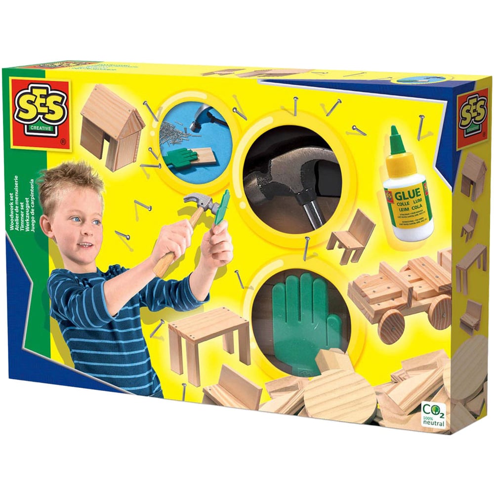 Discover the joy of creativity with the SES Creative Woodwork Set. Introduce your child to woodwork, giving them confidence and building skills such as hand-eye coordination, fine motor and concentration. Kids will love making their very own models and products, giving them a real sense of achievement and providing an excellent rainy day activity. The set is also the safest around, giving you peace of mind and freedom to allow your child to develop a new skill. Comes with a hammer, a hand-shaped hammer guide, glue, assorted nails and assorted wooden pieces. Suitable for 6 plus years.