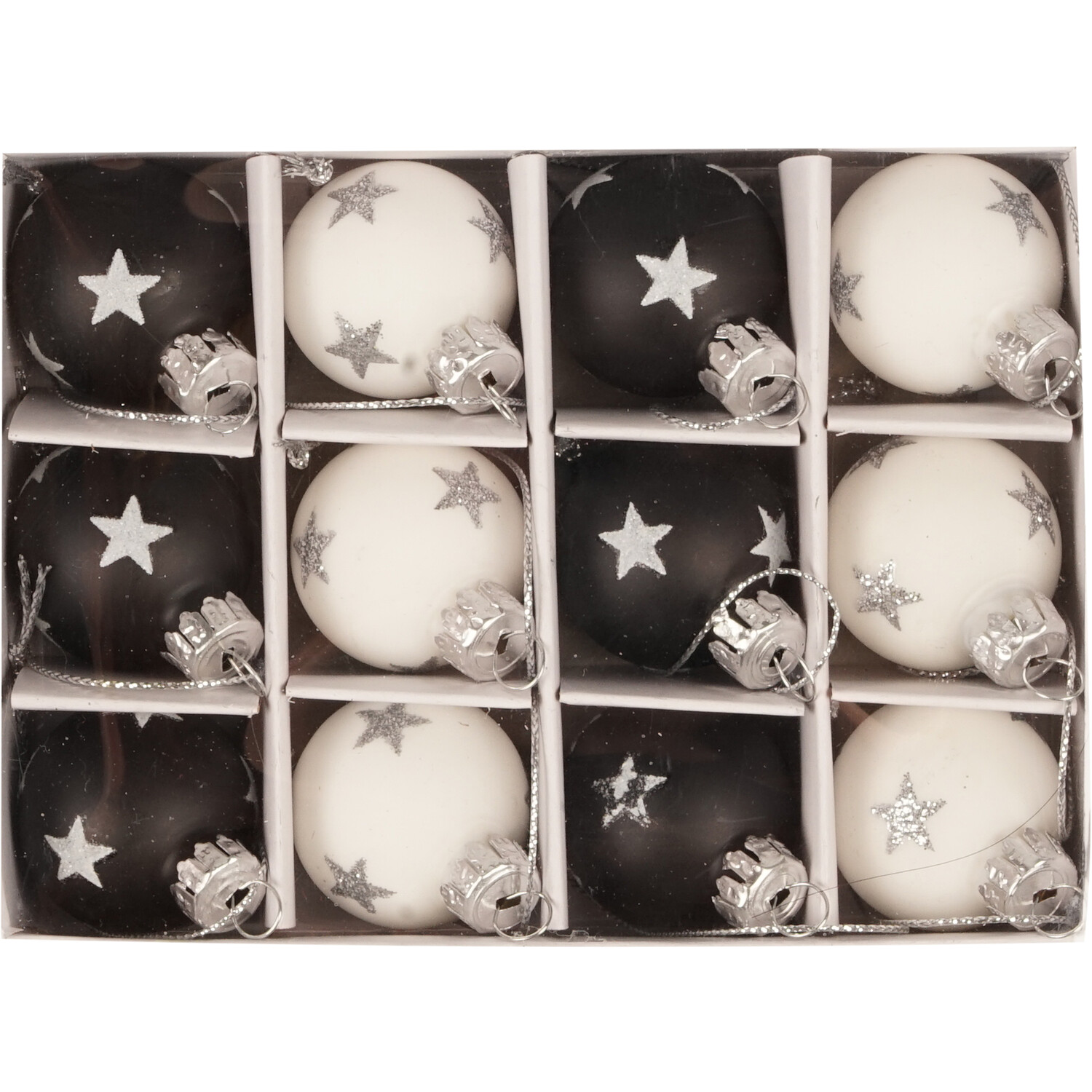 This Set of 12 Matt Black and White Baubles is the perfect accent collection for your Christmas tree. The set includes black and white baubles for a sleek, modern feel this winter. Each one is finished with silver glitter stars for a subtle shimmering effect as they hang from the branches of your Christmas tree.