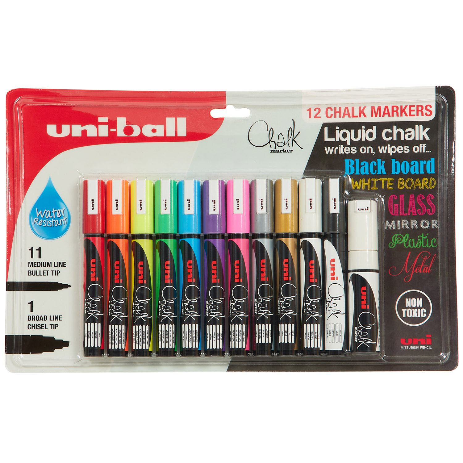 Elevate your writing experience with this Set of 12 Uni Ball Metallic and Neon Chalk Markers. Perfect for creating stunning designs and writing on any surface, the medium-line bullet tip nib type ensures precision and control, while the mixed colours make it a versatile addition to your stationery collection. Non-toxic and water-resistant, these makers make a great option for chalkboards, windows, plastics, metals and other surfaces.