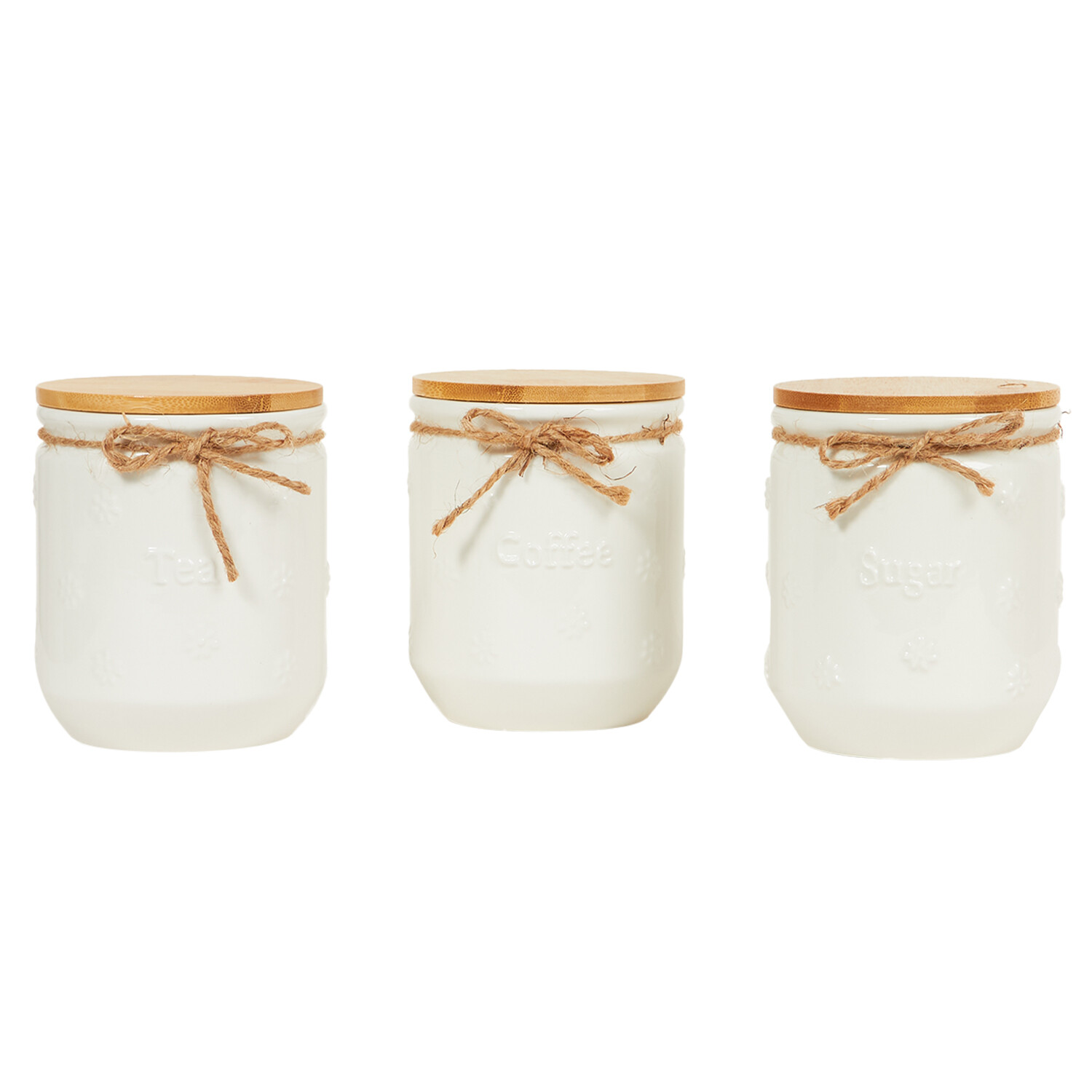 Keep your kitchen essentials neatly stored with this Set of 3 Flower Canisters. These ceramic canisters with twine bow around necks feature a glossy finish in white with embossed text and flowers for a charming look. Complete with bamboo lids and silicone seals, the set will help you store food items and organise your space.