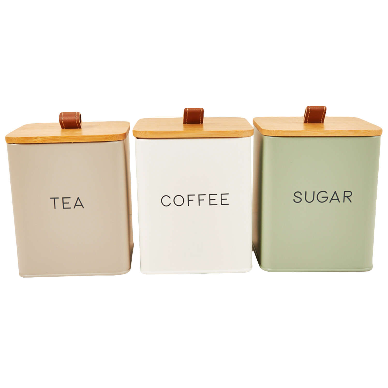 Create a well-organised kitchen with the Set of 3 Neutral Canisters with Leather Handles. Stylish and minimalist, these matt-finished canisters come in three neutral shades to complement various decors perfectly. The canisters are labelled with 'tea', 'coffee' and 'sugar', allowing you to identify them quickly while their bamboo lids are designed with faux leather loop handles for easy opening and closing.