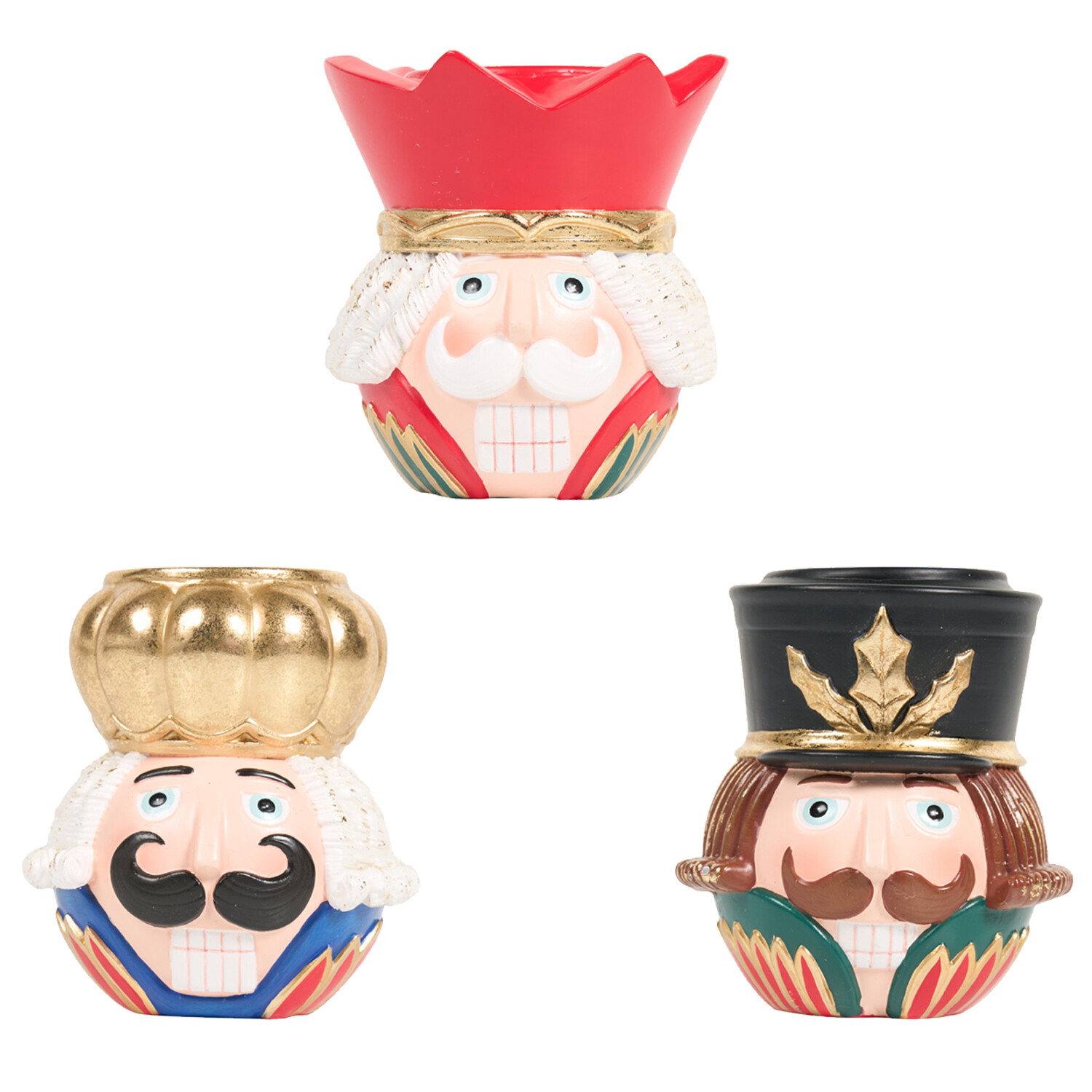 Add a touch of whimsical charm to your home with this Set of 3 Nutcracker Tea Light Holders. Each holder features a uniquely styled nutcracker character, crafted with vibrant detail and ample space to nestle a tealight. Whether you're illuminating the mantel area, dining table, or window ledge, these quirky tealight holders bring joyful character and seasonal glow to any setting.