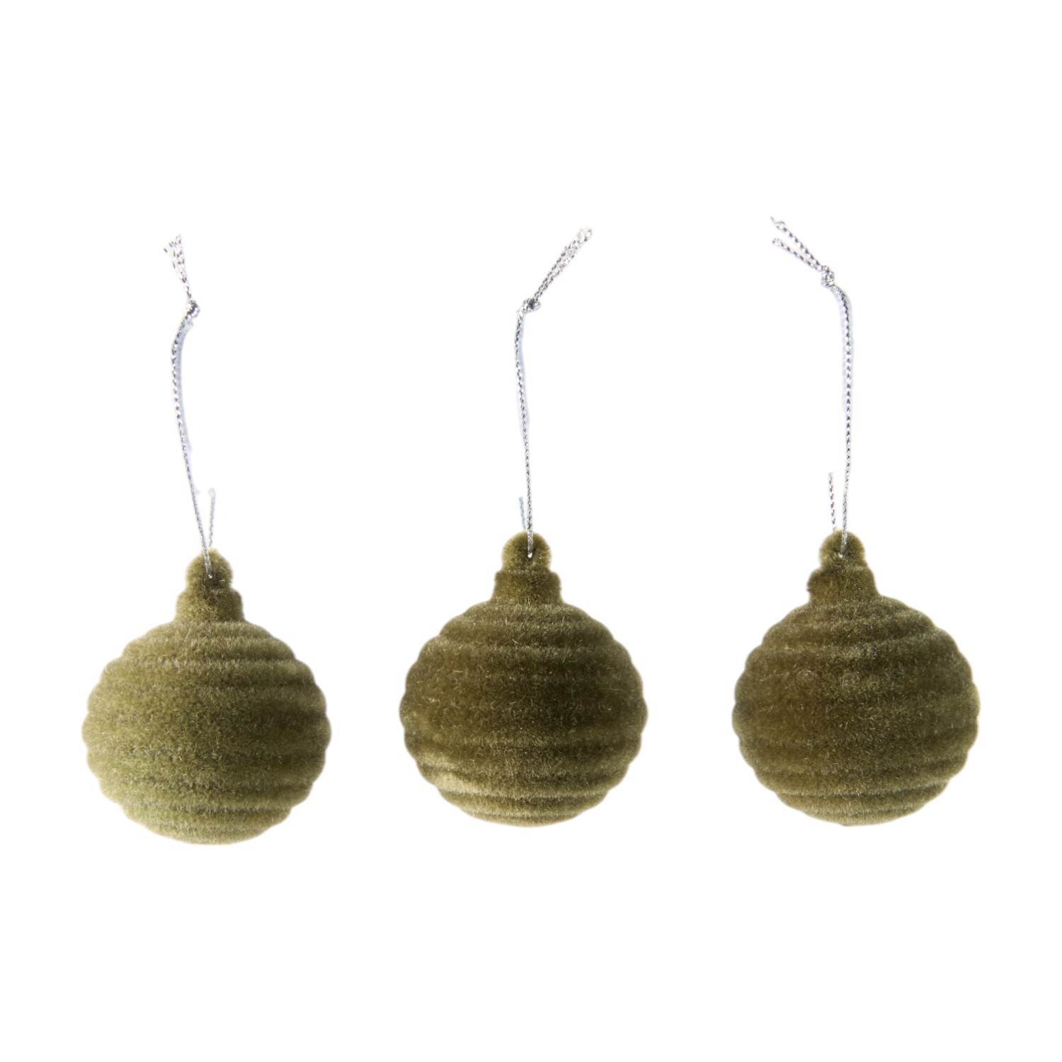 Transform your Christmas tree with the Set of 3 Olive Baubles. Showcasing a classic ribbed design, these baubles add a touch of charm to any Christmas tree. They flaunt a soft, flocked finish that's accentuated by their rich olive tone, enhancing their overall appeal. Perfect for bringing a touch of understated sophistication to your space, they effortlessly enhance your holiday decor.