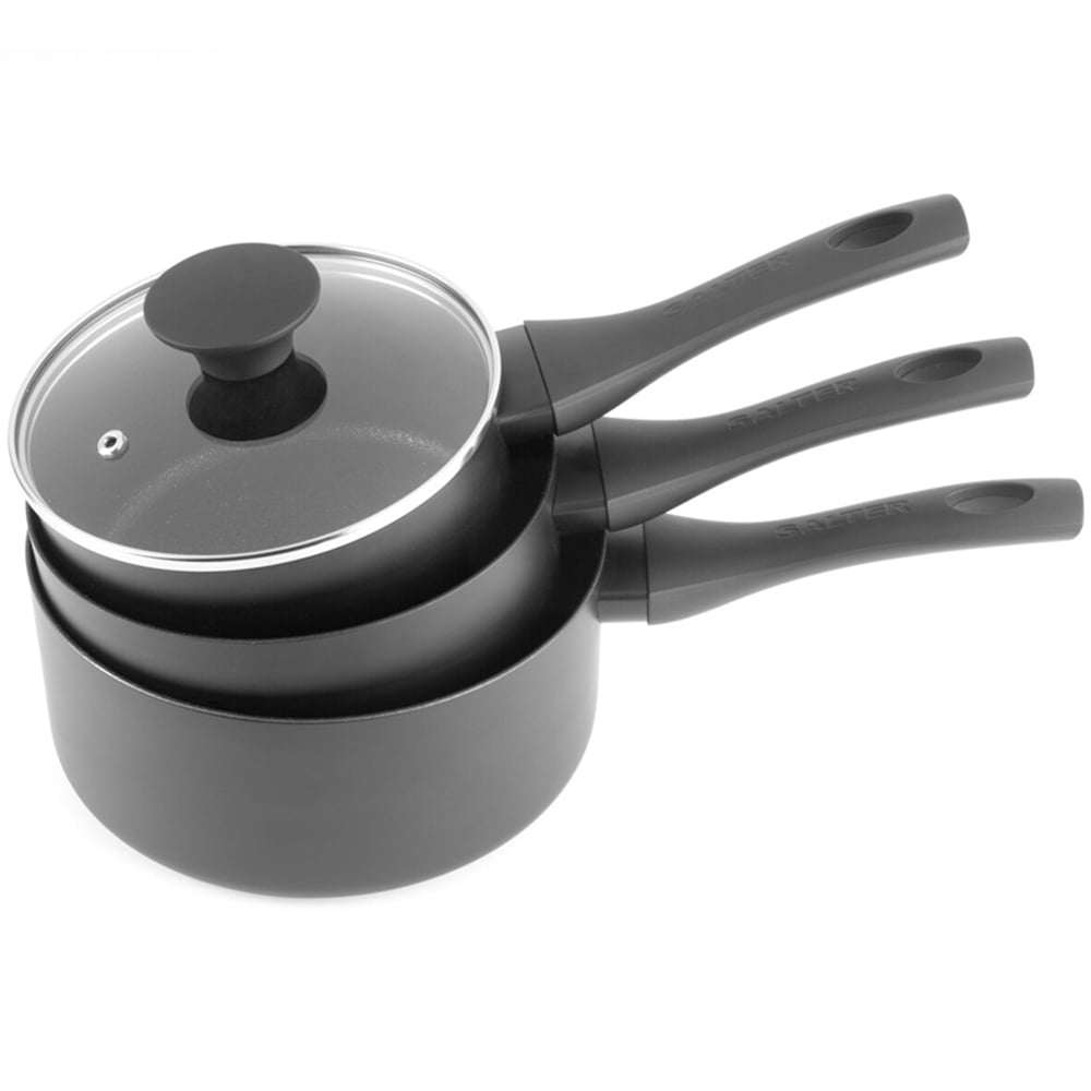 Offering three pans in assorted sizes, this Salter Premium Essentials Saucepan Set will make a practical addition to any kitchen. Each pan uses 2.3mm corrosion-resistant pressed aluminium to make it durable and long-lasting. These pans are finished with a black mega stone non-stick coating for an abrasion-resistant, metal utensil-safe finish. PFOA-free, the coating offers optimum cooking performance with little to no oil. Easy to use and versatile, they are suitable for cooking on all hob types, including induction.