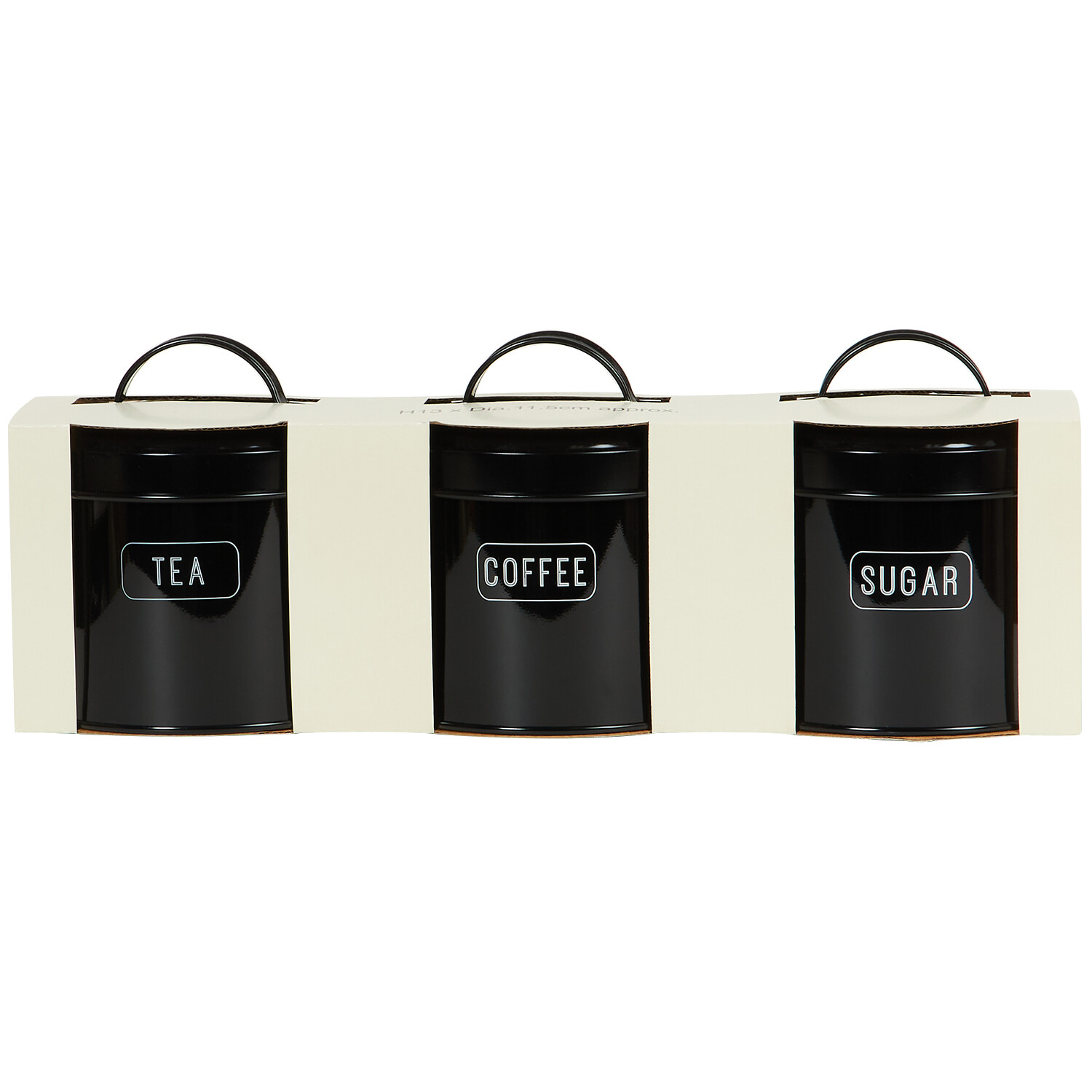 Keep worktops looking neat with this Set of 3 Storage Canisters. Each canister features a round design in classic black and is labelled for easy identification. Simple and easy to coordinate with any kitchen, these black tea, coffee and sugar canisters will help store food supplies while keeping them fresh.