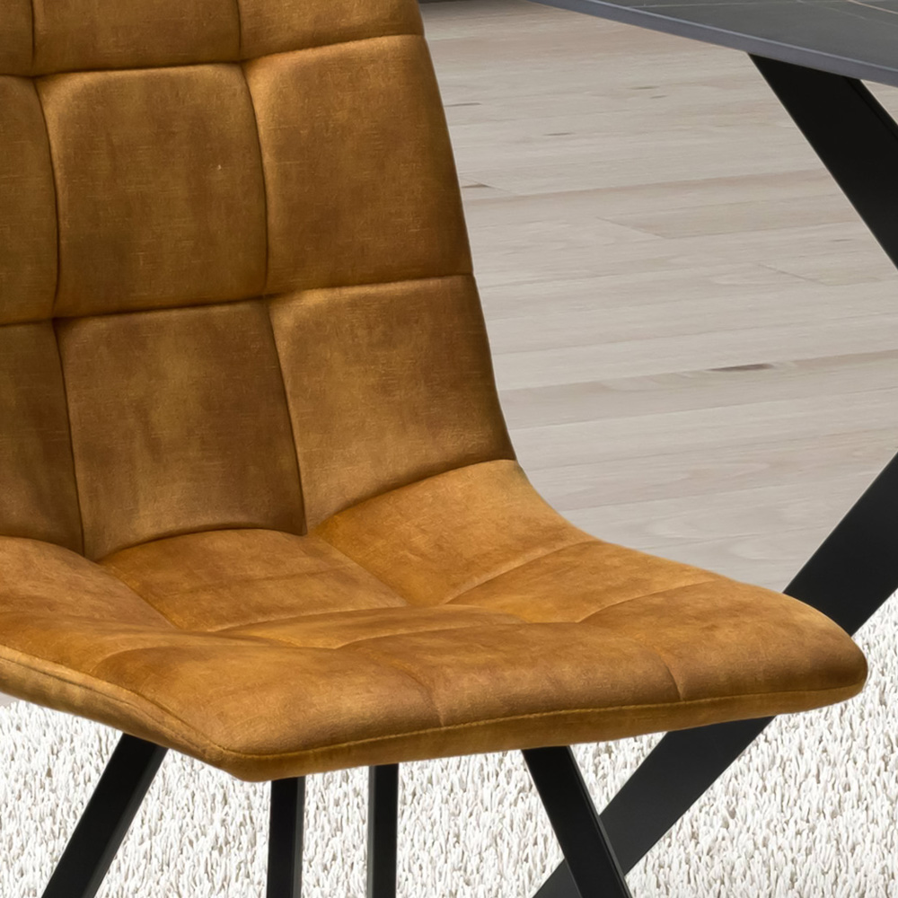 Add a touch of uniqueness to your dining space with the classy Cadiz Dining Chair Set. This splendid set of four dining chairs goes well with modern and traditional interior spaces. This bronze chair set features square waffle back padding with a curved design for utmost comfort. This set also features cosy padded seats with soft velvet upholstery and firm backrests fitted with black metal tapered legs for stability and support. Assembly required.