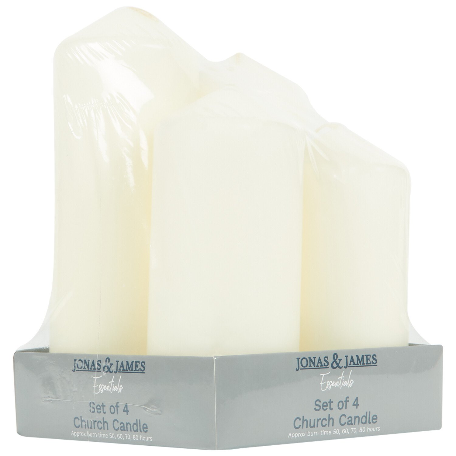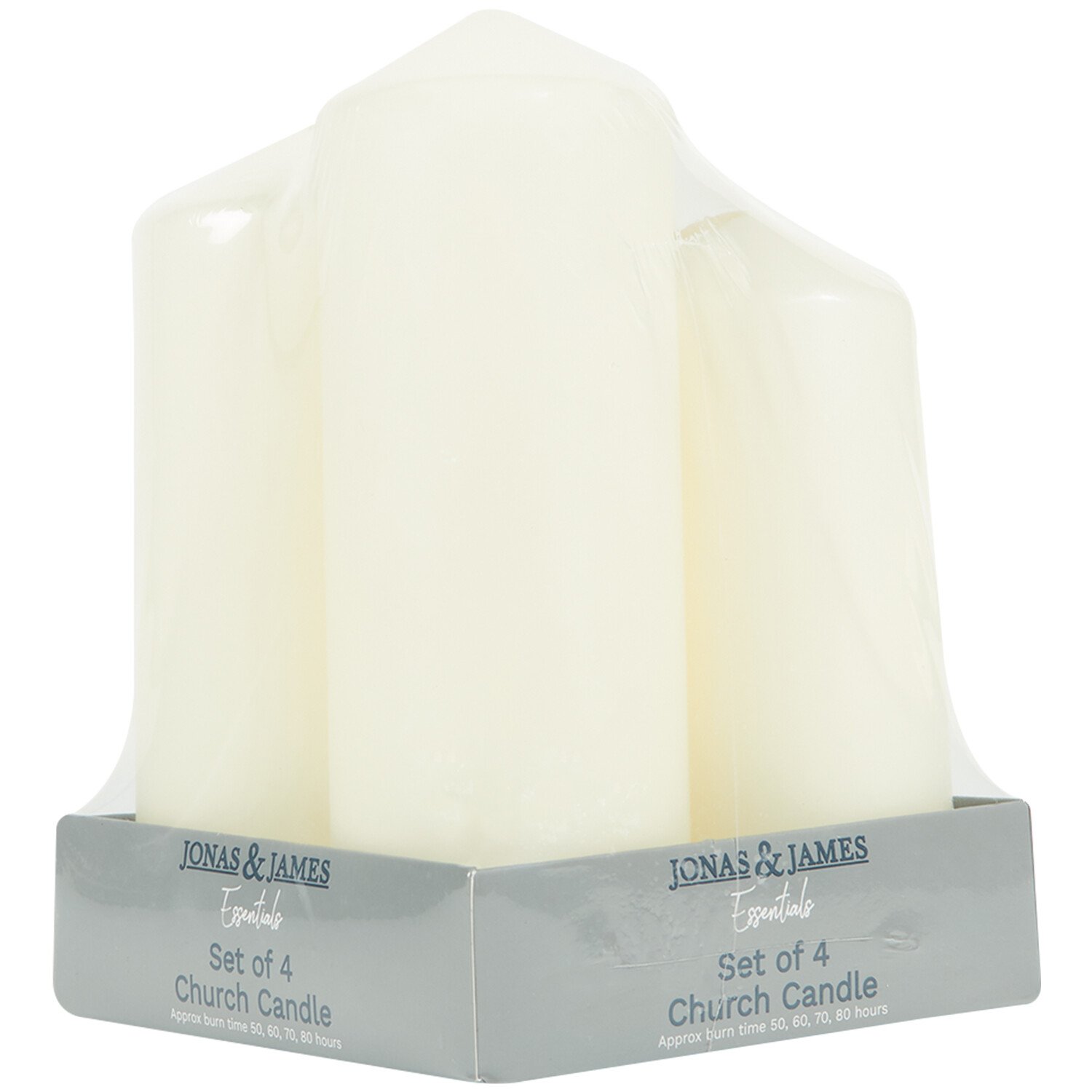 Create a warm and inviting atmosphere with this Set of 4 White Church Candles. Perfect for adding a cosy touch to any room, these classic candles can be displayed on their own or placed around a decoration for an elegant finish. They bring a soft glow that enhances any space.