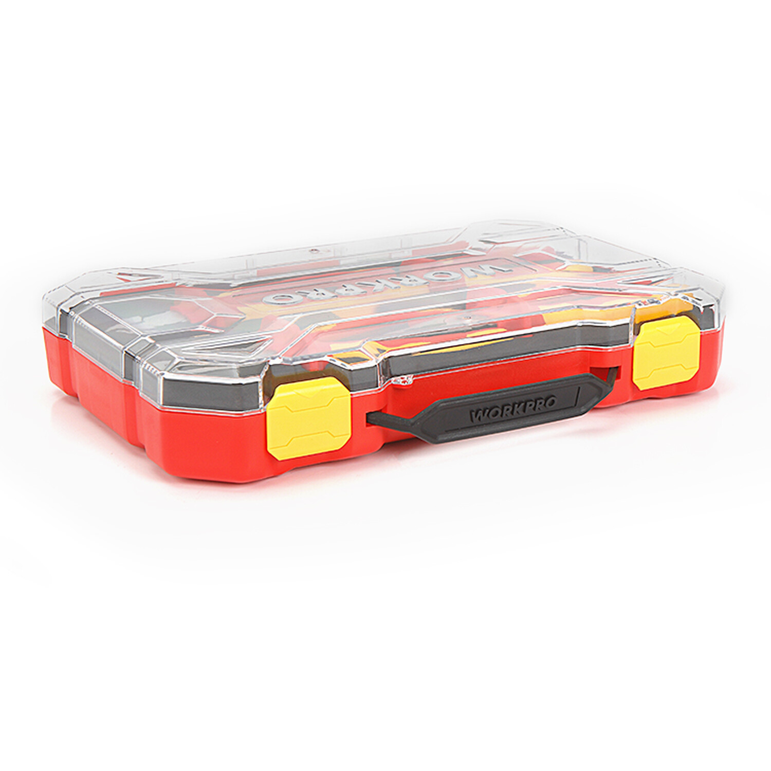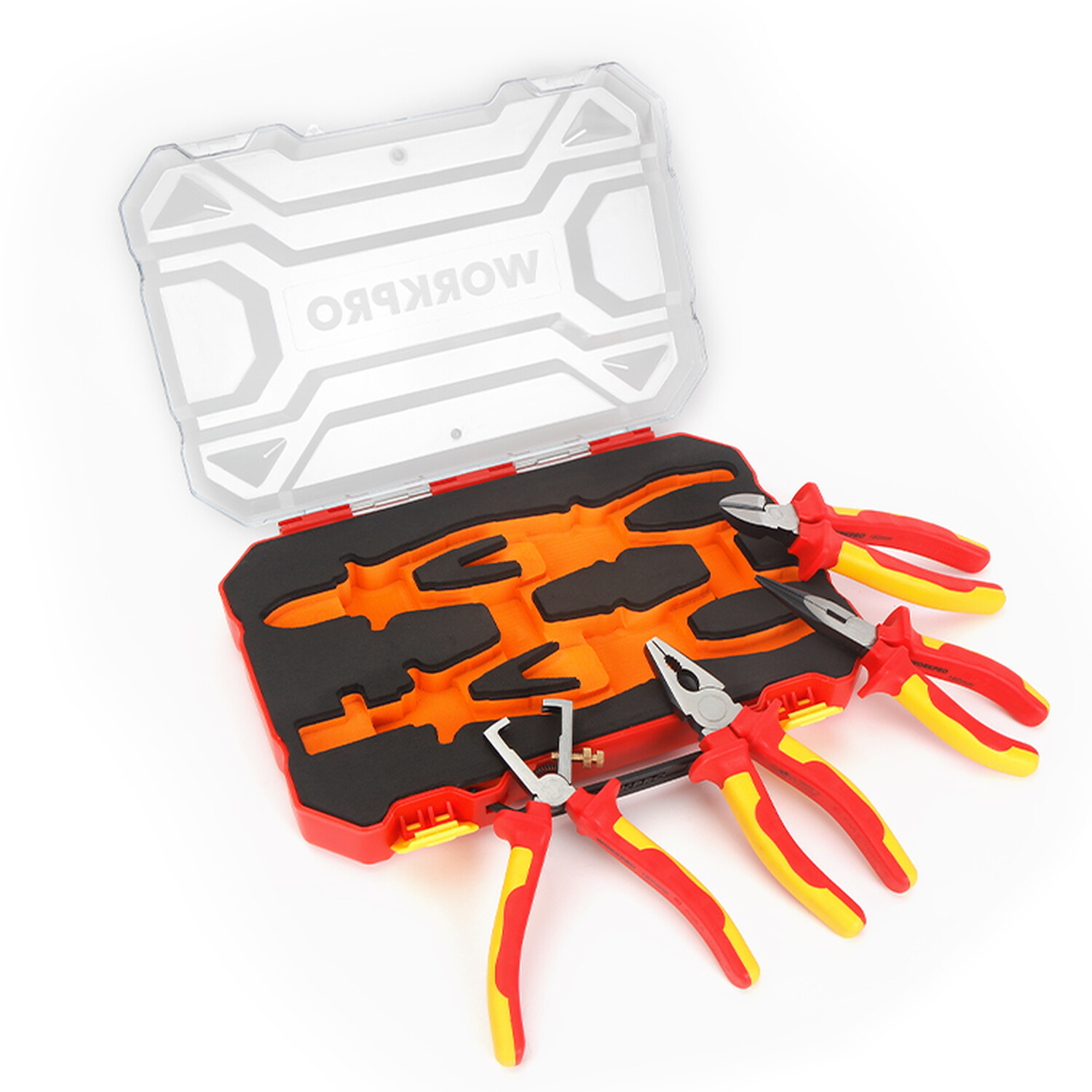 Make a practical addition to your toolbox with this Set of 4 Workpro Insulated Pliers. Each tool features cutting edges for easy cutting of both soft and hard wires. They also feature ergonomically shaped two-component handles to offer a comfortable grip and the utmost safety while working. They are manufactured per EN/IEC 60900, and individually tested at 10000V AC and approved for 1000 V AC. The set comes complete with a portable transparent plastic box, which makes it easy to carry.