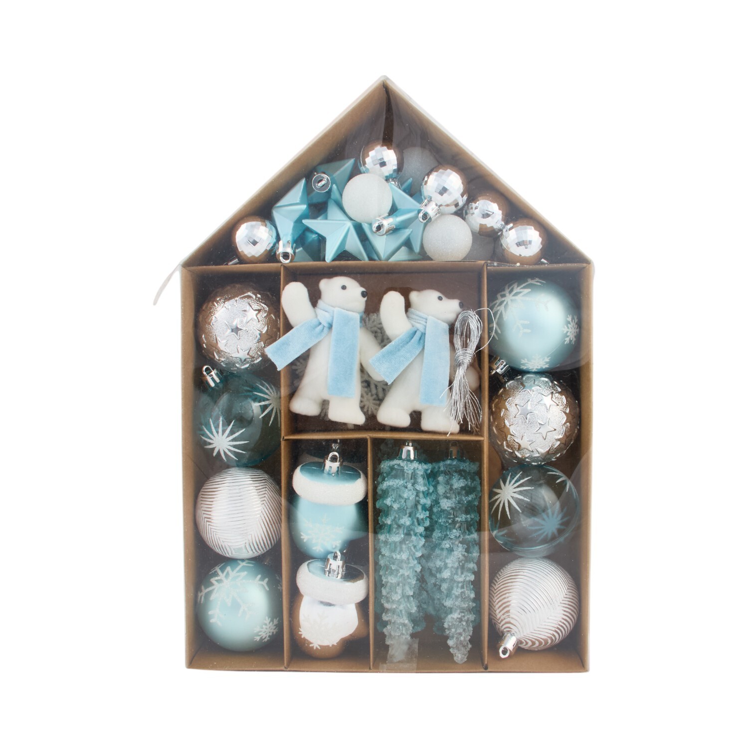 Enhance your holiday decor with a magical touch with the Set of 50 Angel Whispers Baubles. Featuring star, bear, icicle, and glove designs, each bauble flaunts a stunning colour and finish to adorn your Christmas tree instantly. They are beautifully crafted to complement various homes effortlessly, creating a magical festive atmosphere in your home. With their cool tones and winter-inspired look, they are perfect for transforming your home into a winter wonderland.
