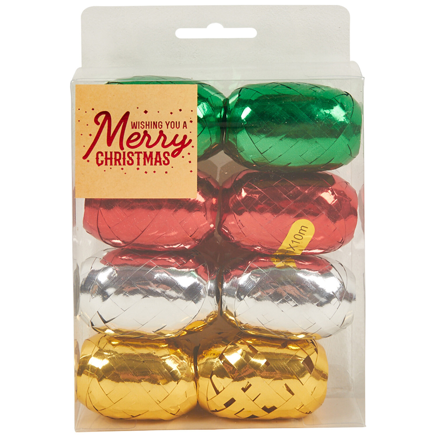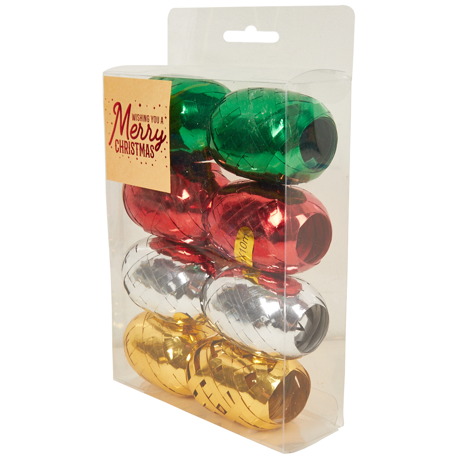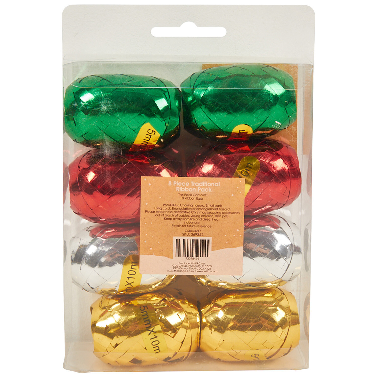 Add a classic touch to your festive decor with this Set of 8 Traditional Ribbons. This set includes two gold ribbons, two silver ribbons, two red ribbons, and two green ribbons, providing a variety of Christmas-themed designs. Ideal for wrapping presents, decorating wreaths, or enhancing holiday craft projects, these vibrant ribbons add a charming and elegant finish to your Christmas preparations.