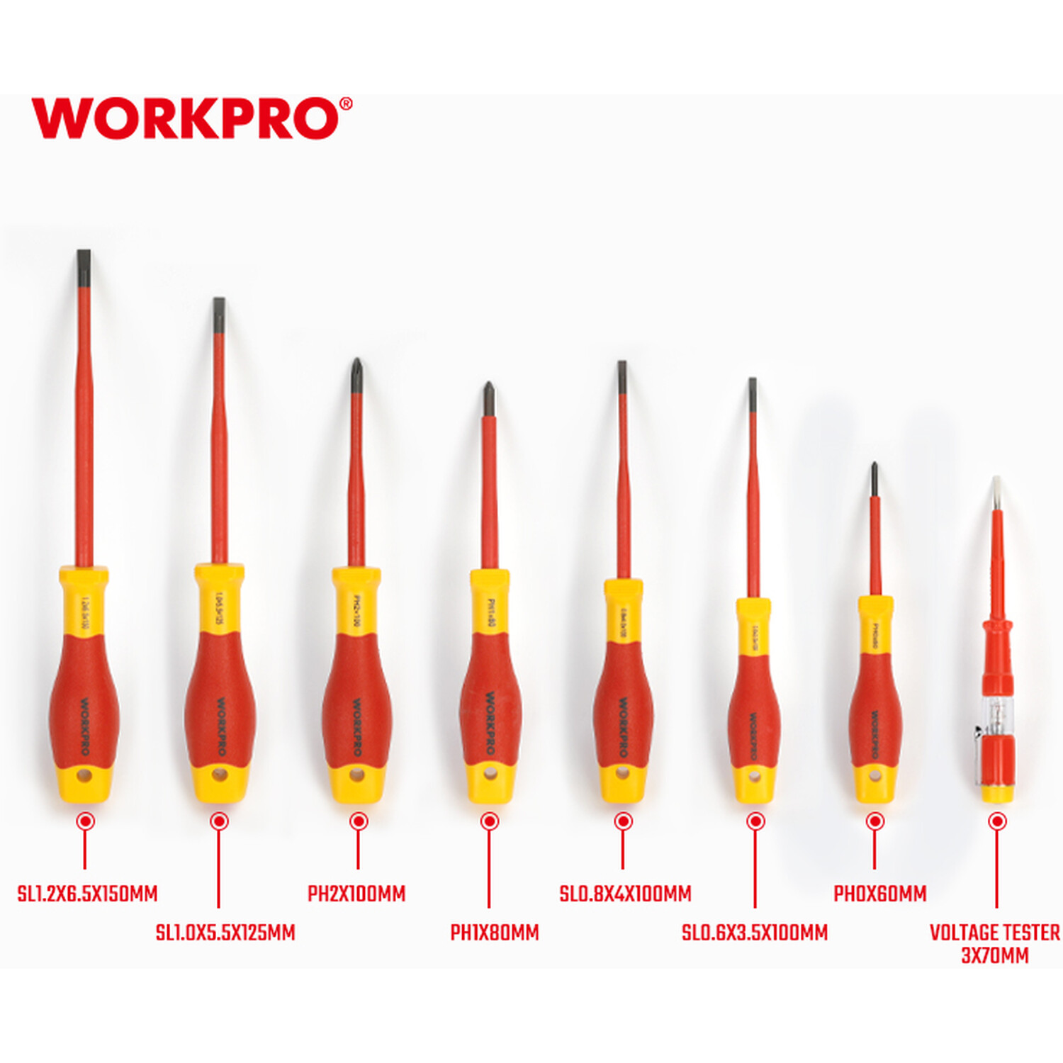 Get a helping hand in most common electrical works with this Set of 8 Workpro Insulated Screwdrivers. These tools are made from chrome vanadium molybdenum steel and feature ergonomically shaped two-component handles to offer a comfortable grip and the utmost safety while working. Each tool is individually tested at 10000V AC and approved for 1000V AC. Packed in a portable transparent plastic box, the set will make a practical addition to your toolbox.