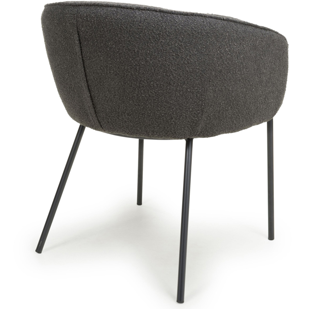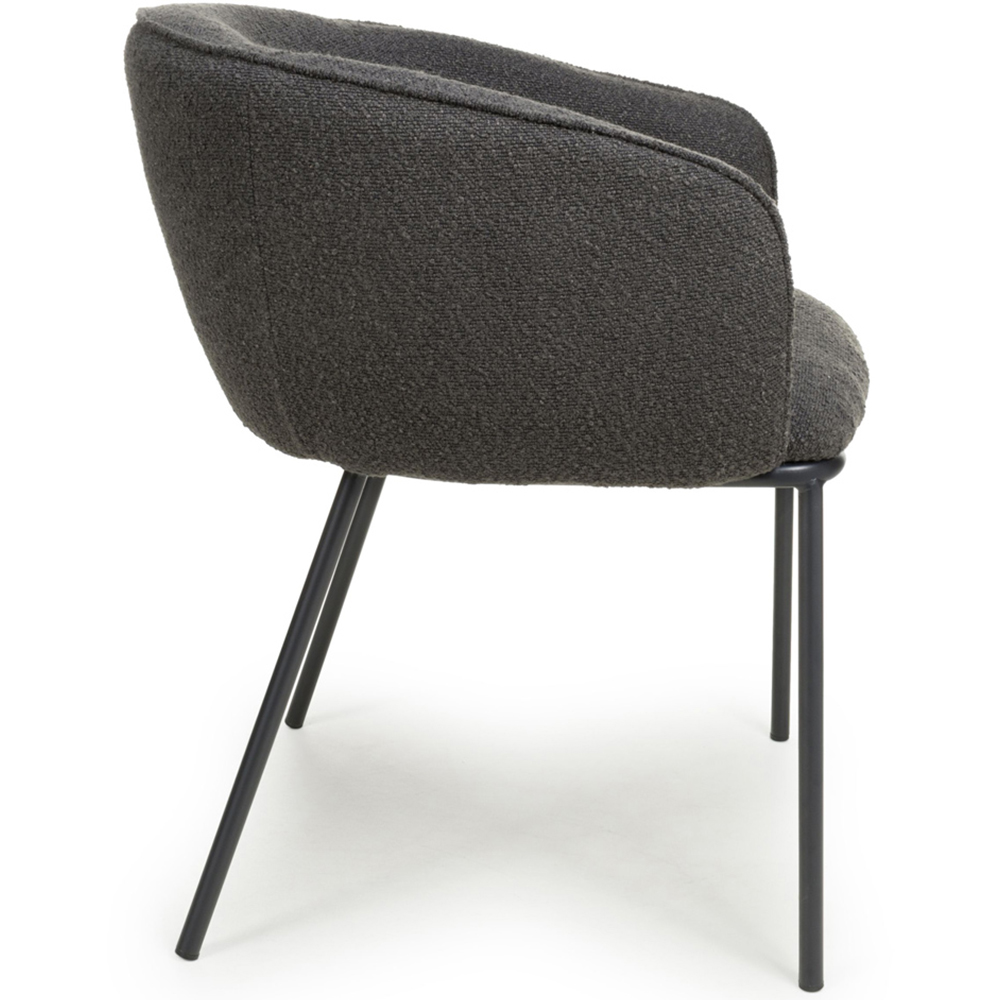 Elevate your dining experience with the Shankar Lola Set of 2 Grey Boucle Dining Chair. This has a fashionable curvy modern dining chair, upholstered in luxurious boucle fabric. The spacious bucket seat is supported by high attractively curved armrests. This versatile chair has a stylish rounded black metal frame, supported by splayed legs. This product requires assembly. It is sold in boxes of 2.