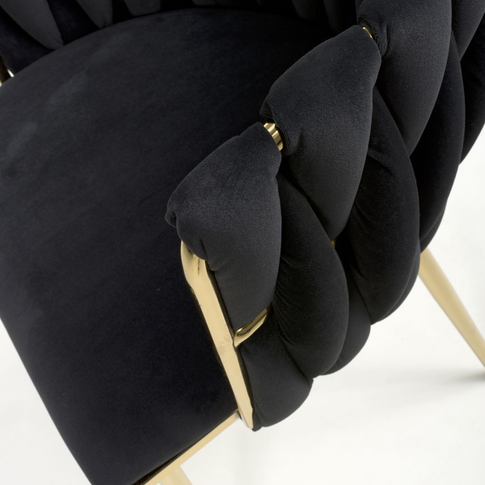 Elevate your dining experience with the Shankar Ontario Set of 2 Black Brushed Velvet Dining Chair. It is an exquisitely woven accent chair with a stunning gold frame. The Black Brushed Velvet upholstery is threaded around the semi-circular gold backrest frame which creates the ultimate in elegance. It features comfortable supported armrests and a padded seat to complete the look. The chair is supported by matching metal legs with adjustable feet. This product requires assembly. It is sold in sets of 2.