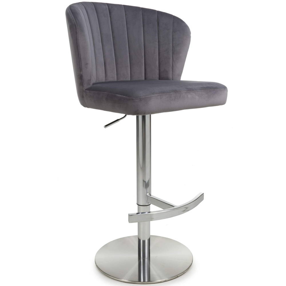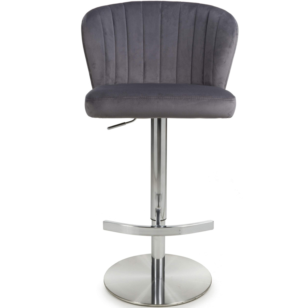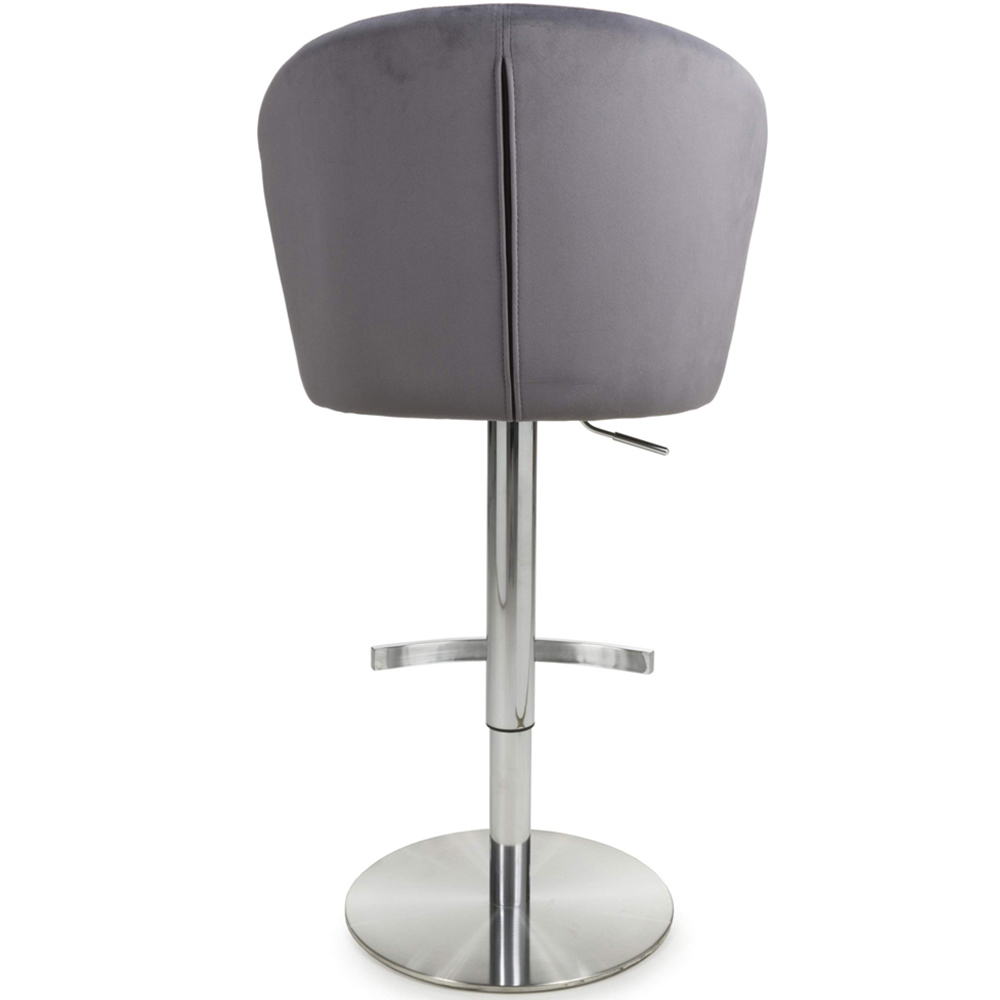 Add a classy look to your space with the Shankar Sigma Grey Brushed Velvet Bar Stool. It features a luxurious shell-backed modern bar stool, upholstered in mink-brushed velvet fabric. The curved seat is supported by a stunning brushed stainless steel circular column and base. The stool height adjusts from 93cm to 113cm via an under-seat handle. The seat also swivels 360 degrees. This product requires assembly. It is sold individually.