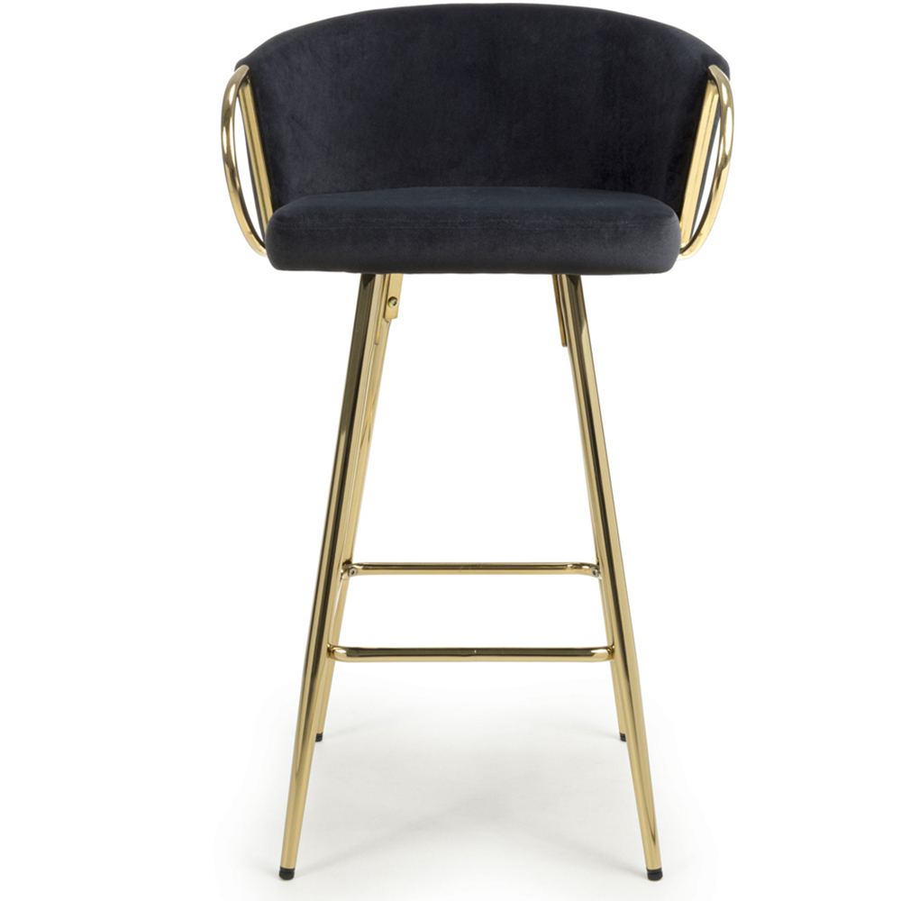 Add a classy look to your space with the Shankar Volero Black Brushed Velvet Bar Stool. This chair gives a lavish vibe with a gold-framed bar stool which exudes quality. The snug comfortable seat is upholstered in a tactile textured fabric. The circular backrest is crowned by D-shaped gold handles, doubling as armrests and grips for entering and exiting the stool. An opulent tubular gold-covered chrome frame supports the stool, secured by a handy square footrest. This product requires assembly. It is sold individually.