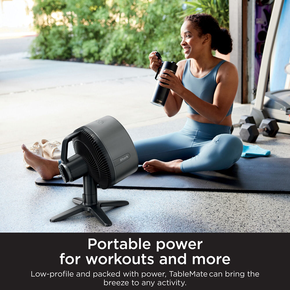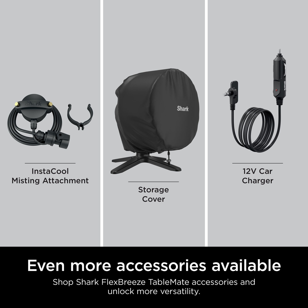 The Shark FlexBreeze TableMate delivers exceptional cooling power that goes where you go. From corded to cordless, the Shark FlexBreeze TableMate keeps you cool both inside and outside the home. When plugged in, it automatically charges, ensuring it's always ready to go. With its easy-carry handle, lightweight design, and up to 24 hours (based on fan speed one without oscillation) of cordless runtime, it’s perfect for keeping cool on the move. With the Shark FlexBreeze TableMate, you can fine-tune your cooling with five fan speeds, 180 degrees of side-to-side oscillation, and a 55° tilt to keep the air circulating so everyone stays cool. Powerful in any setting, the high-velocity fan has a reach of up to 20 meters, delivering a cooling breeze even from a distance. A sleek, minimalist design makes the Shark FlexBreeze TableMate a stylish addition to the home. Its rain and UV resistance (materials UV-resistant per UL746C) help resist fading and discolouration from the sun, making it suitable for outdoor use, rain or shine. Quiet and unobtrusive at any speed, it’s perfect for sleeping, working from home, or enjoying a quiet evening on the patio. Enjoy a two-year guarantee upon registration with Shark. Based on temperature reduction in a controlled environment at 30 degree and 2.7meters from the fan, and 50% relative humidity. Performance will vary with environmental factors.