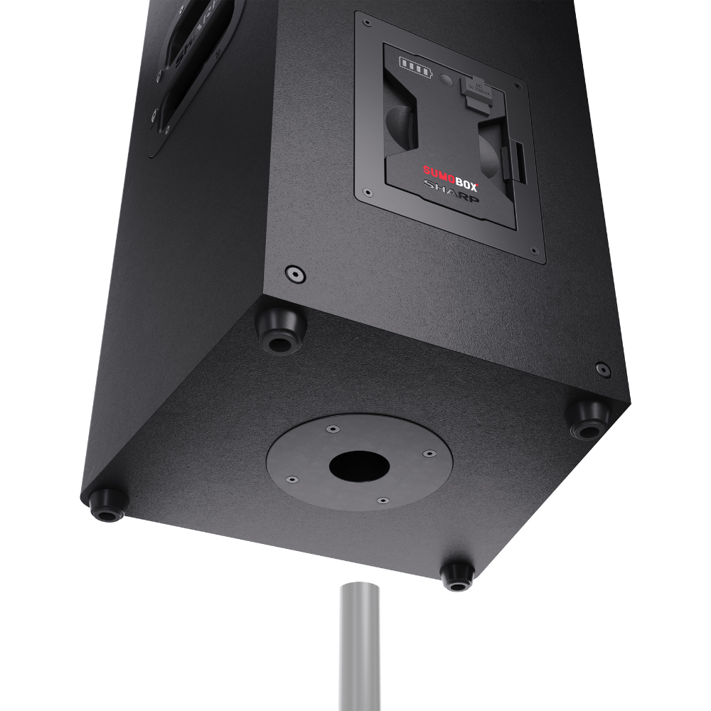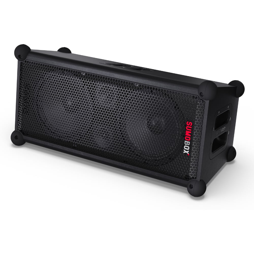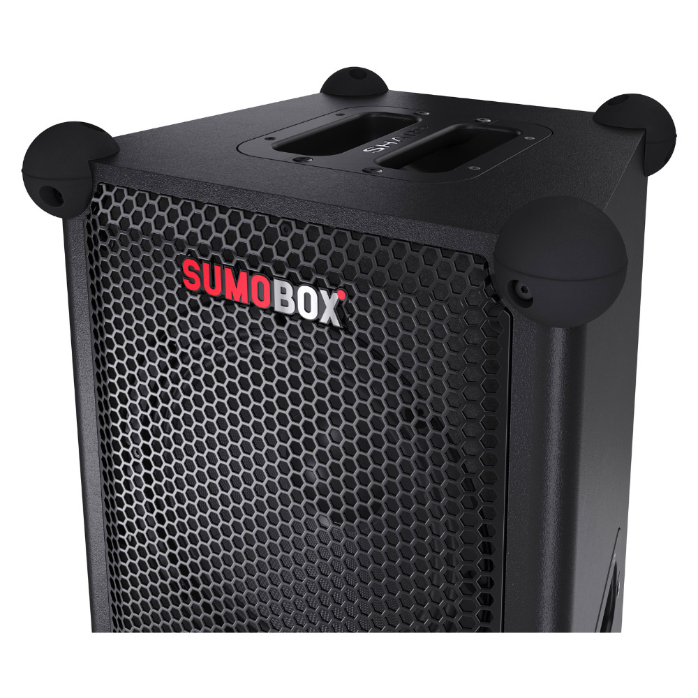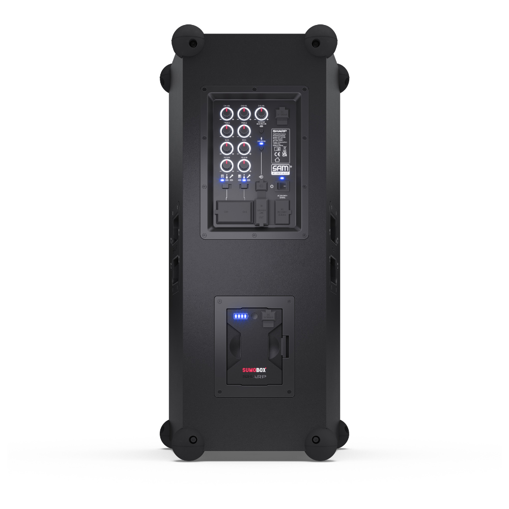 Enjoy a peaceful evening with your favourite song with this Sharp Black Sumobox Portable Speaker 120W. This versatile and portable speaker is powered by a removable/rechargeable lithium-ion battery pack and can deliver up to 105dB of pure sound pleasure via two x eight” woofers and two x two” tweeters. It offers up to 10 hours of playtime from the removable 14.8V 5Ah Lithium-ion battery pack (included). It gets instant continuity with a spare battery pack (sold separately) or by connecting to the mains power supply. The three-channel pro panel consists of a combo of TRS/XLR with reverb, bass and treble and aux/Bluetooth, all with independent level control. SAM® by Devialet provides improved linearity and low-frequency performance to experience rich, detailed, and powerful bass with limited audible distortion. You can pair two Sumobox speakers for duo mode true wireless stereo (TWS), left and right channel sound, or use the amplified speaker link to link two or more Sumobox.