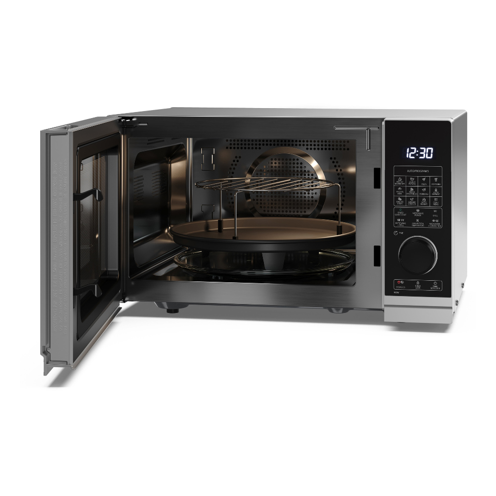Give your friends and family a delicious treat with this Sharp YC-PC254AU-S 25L Convection Jog Dial Microwave 900W. This microwave offers 900W of microwave power with ten power levels and 14 automatic cooking programs (including the defrost function). Also, a 1200W grill can bring more enjoyment and variety to your quick cooking. Ideally, You can grill sausages, steaks, and chicken in this microwave. Its 25L capacity ensures it easily holds a dinner plate on the 270mm glass turntable. A grill rack is included to get the most out of your 1200W grill. There is also a 2200W convection setting for further cooking control, allowing you to turn this microwave into a temporary oven for more complex dishes. The timer can be set for up to 30 minutes to ensure your food is perfectly cooked and in large quantities. With its user-friendly semi-digital control panel, choosing the right setting is made simple, and the flat contours of the microwave are designed to be easily wiped clean. The microwave also comes equipped with a baking tray.
