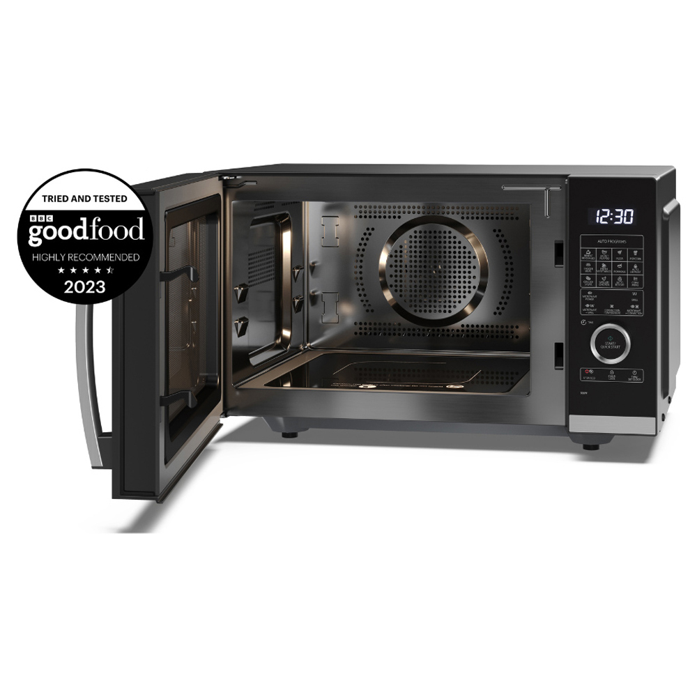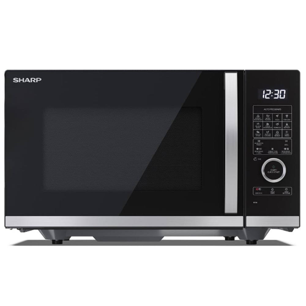 Give your friends and family a delicious treat with this Sharp YC-QC254U-B 25L Convection Jog Dial Flatbed Microwave 900W. This flatbed microwave offers 900W of microwave power, ten energy levels, and 14 automatic programs (including the defrost function). Also, the 2050W convection power and 1050W grill can bring even more enjoyment and variety to your quick cooking. Ideally, You can grill sausages, steaks, and chicken in this microwave. The 25L capacity comprises a spacious flatbed that perfectly holds the grill rack. Also, the cooking programs allow for an extensive array of quick-cooking options and an automatic defrost function, enabling you to adjust the time and weight to your needs. Its user-friendly semi-digital control panel makes choosing the right setting simple, and the flat contours are designed to be easily wiped clean. The white LED display functions as a clock when the microwave is not in use and has a kitchen timer function.