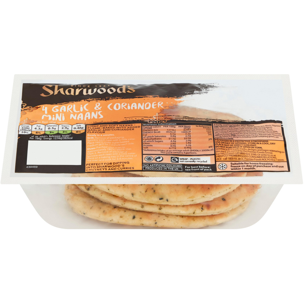 Ingredients: Wheat Flour (With Added Calcium, Iron, Niacin, Thiamin), Water, Rapeseed Oil, Sugar, Garlic Granules (2%), Raising Agents (Diphosphates, Potassium Carbonates), Garlic Purée (1%), Yeast, Preservatives (Calcium Propionate, Potassium Sorbate), Kalonji Seeds, Salt, Coriander Leaf, Acid (Citric Acid), Ground Coriander, Ground Fennel, Yoghurt Powder (Milk), Ground Cumin, Parsley, Natural Garlic Flavouring