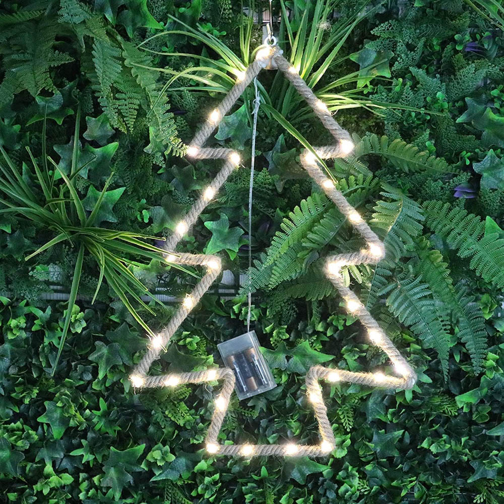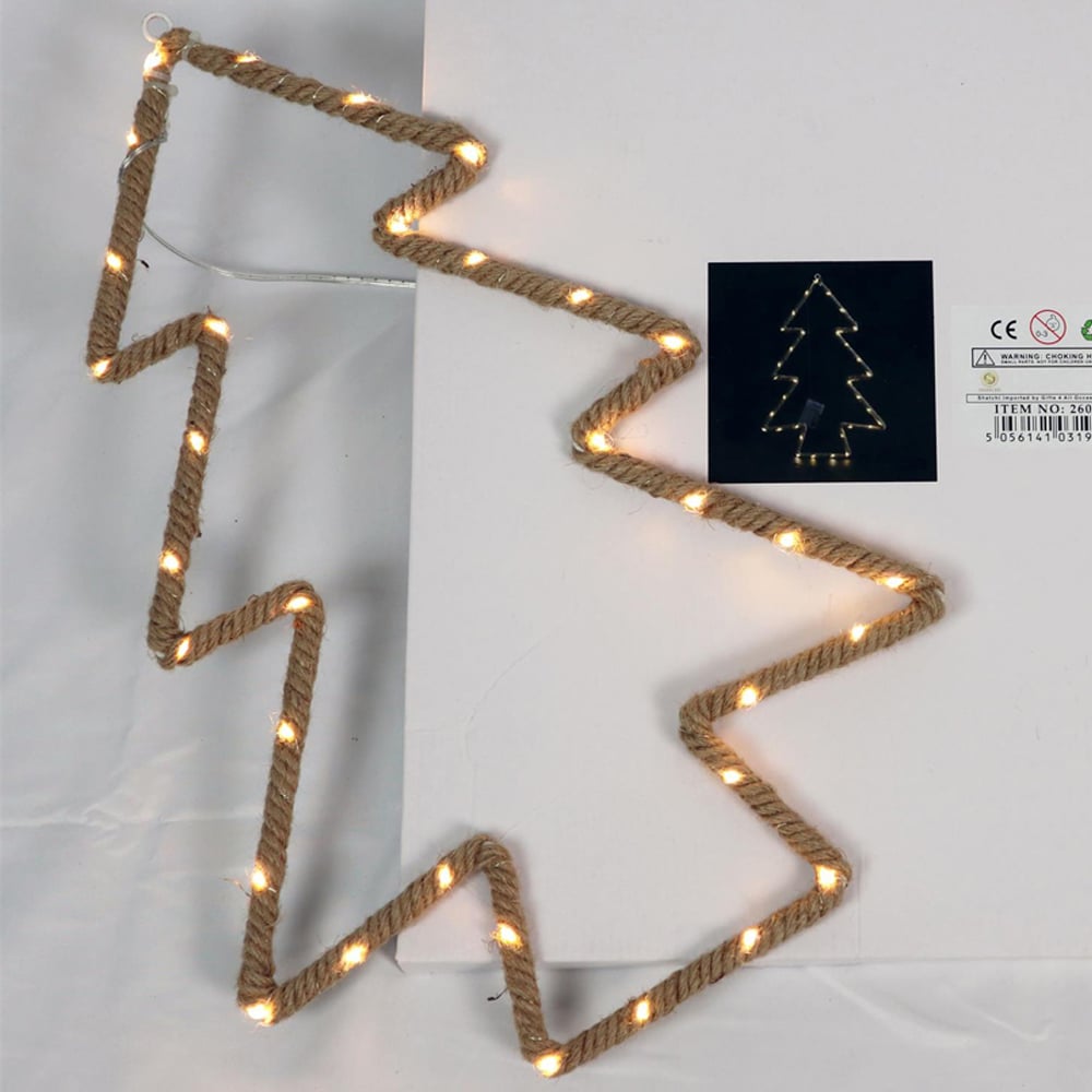 If you want to go for that earthy, bohemian aesthetic vibe for your interior, you might want to have a close look at our rope silhouette. It’s got that rustic look going and will be great for adding tasteful accent lighting to your home. Specifications: It consists twin bells-shaped metal frame wrapped with hemp rope and 33 warm white LED copper string lights. Light Colour: Warm White. Shape: Christmas tree. Size:- 34 x 50cm. Lead wire: 30cm. Battery Operated. 3 x AA Battery Required (Not Included).