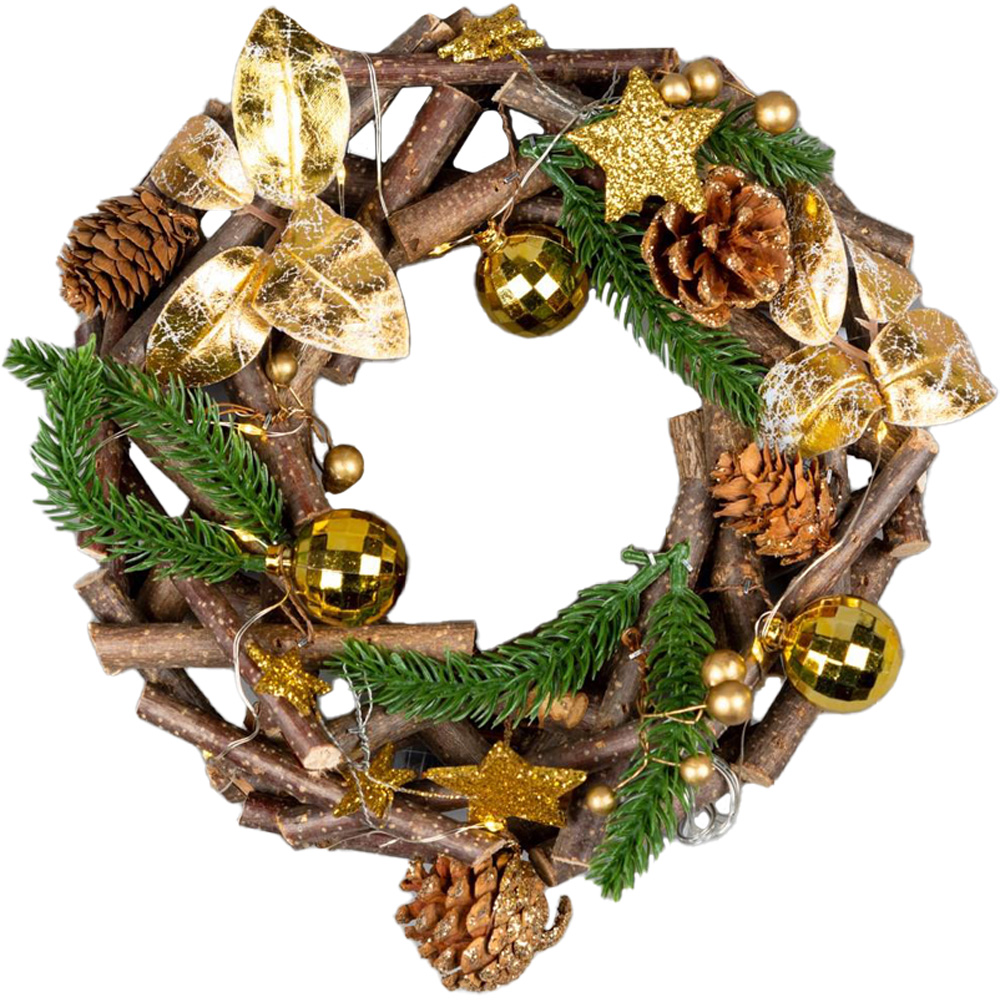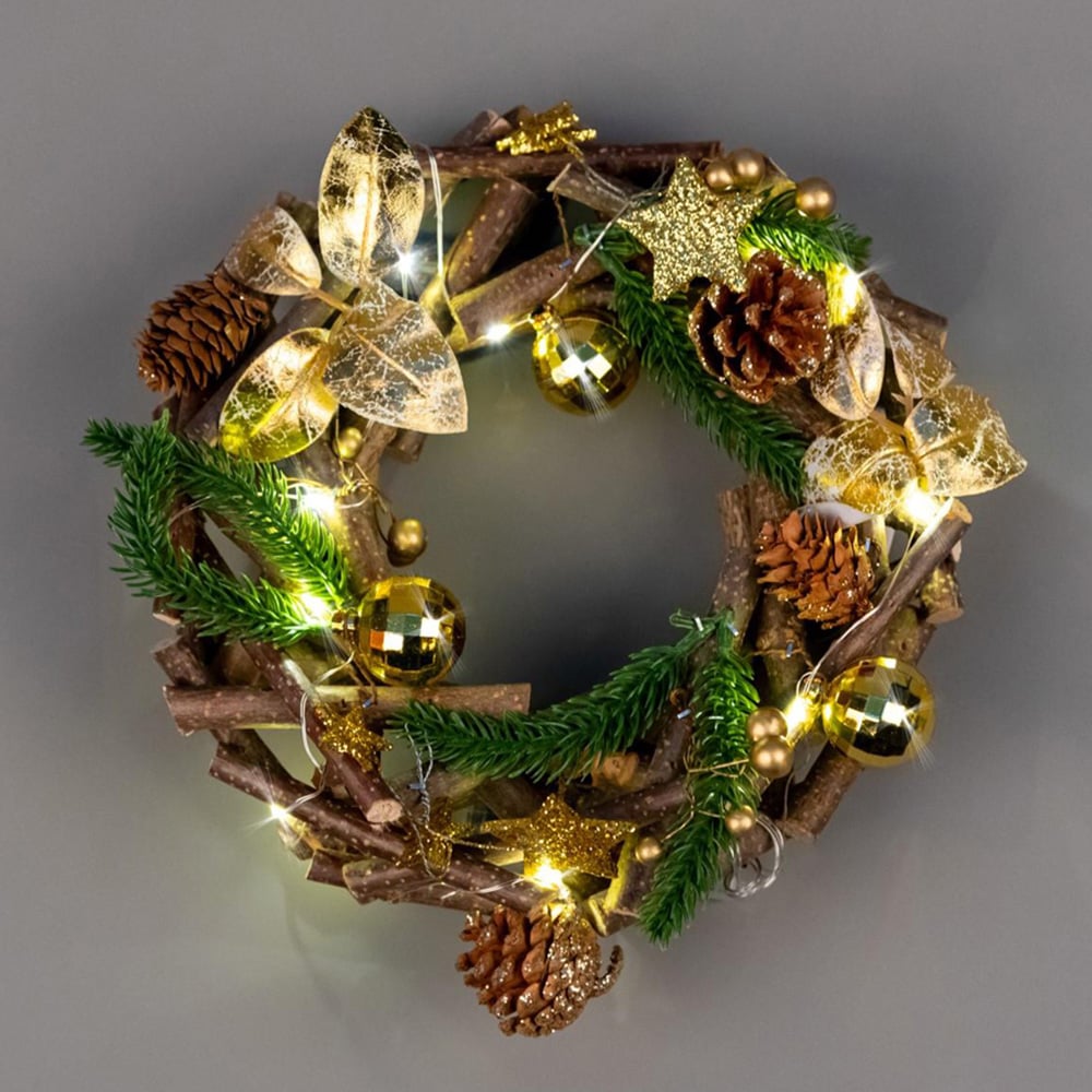 Versatile Décor: Whether adorning your front door, hanging above the fireplace, or gracing your dining table as a centrepiece, this wreath effortlessly elevates the atmosphere and spreads holiday cheer throughout your home.Specifications:Diameter: 22cm (8.7 inches). Battery Operated: Requires 2 x AA batteries (not included).Decorated with Warm White LED Lights Elegant Golden Baubles, Berries and Leaves, Charming Stars, Lush Green Foliage & Rustic Pine Cones. Material: Twig & PVC.
