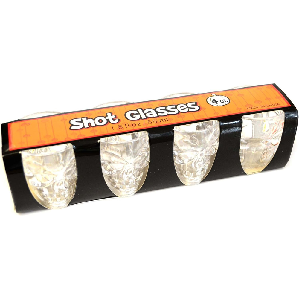 • Includes 4 3D spooky skull-shaped shot glasses