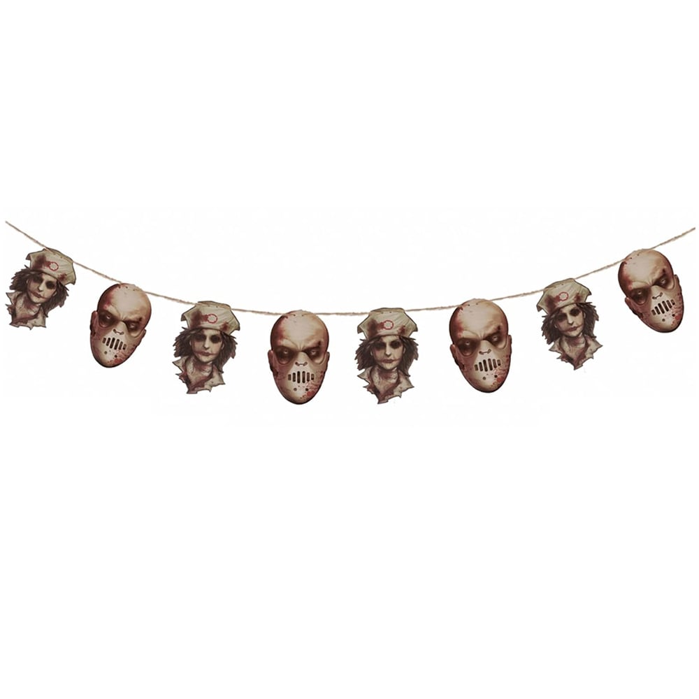 Transform your space into a chilling den of horror with the Shatchi Halloween Chopped Bloody Faces Garland 240cm. This garland features eight assorted hanging bloody head cut-outs suspended on eerie black swirls, creating a spine-tingling atmosphere. Each head measures 24 x 16cm, meticulously crafted to evoke a sense of dread and unease. With an attached string, setting up this garland is effortless. It is perfect for hanging across doorways, windows, walls, or staircases to create a nightmarish scene straight out of a horror movie. It is ideal for horror-themed parties, haunted houses, or any spooky event. Please note: Product appearance may vary from images, as the picture shown is for illustration purposes only.