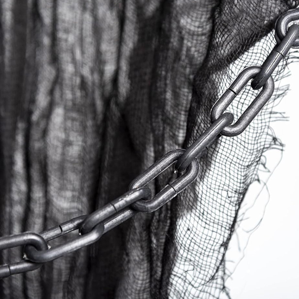 Create a bone-chilling atmosphere with the Hanging Ghost Skeleton Halloween Decor 90cm. This prop features a menacing skeleton in distressed, tattered clothing, complete with chained arms that add a touch of horror to any setting. It is the perfect addition to haunted houses, spooky displays, or Halloween parties. Designed for effortless hanging, it includes a convenient hook, making it easy to hang from eaves, trees, or porches for an instant scare factor. Crafted from durable polyester and plastic, this ghost skeleton is built to endure, ensuring it remains a standout piece in the Halloween collection year after year. Size: 91cm.