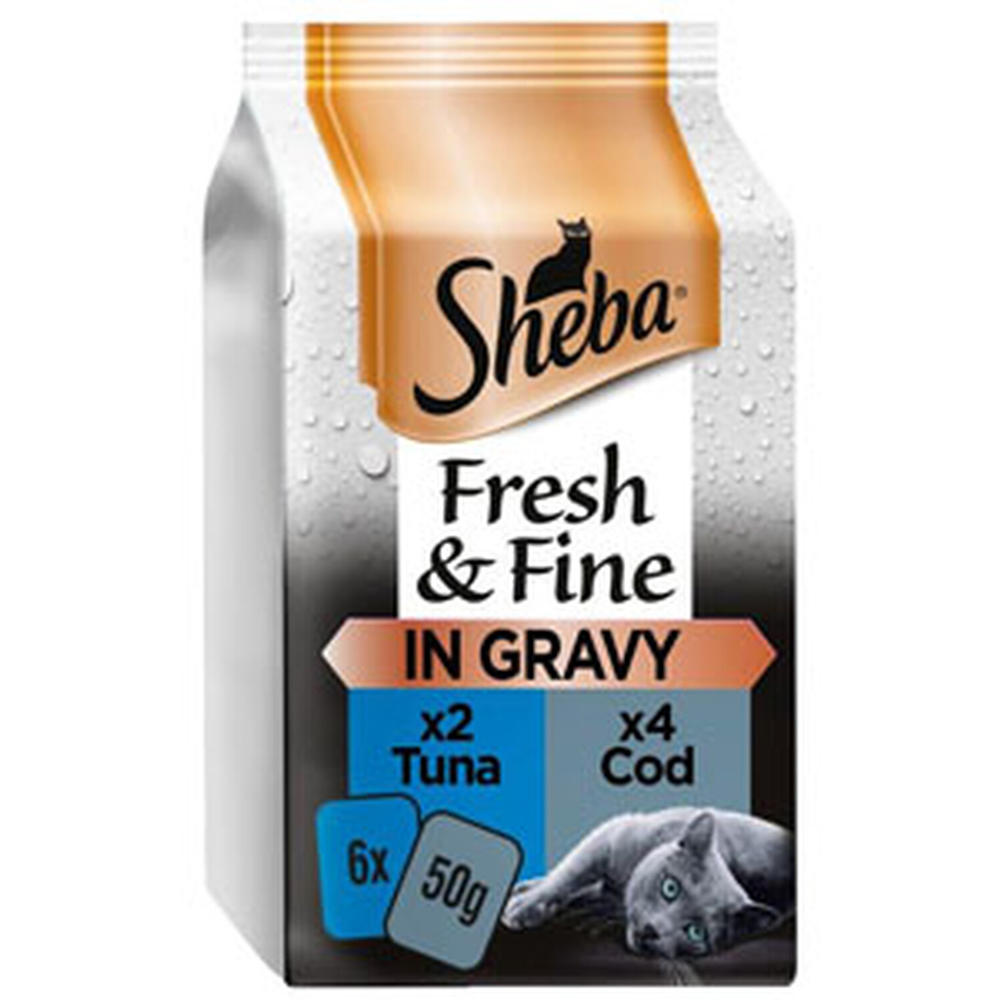 Keep your furry friend engaged in dinner time with Sheba Tuna and Cod in Gravy Fresh and Fine Wet Cat Food 50g 6 Pack. It includes delicately sliced pieces, served in a silky Sheba cat food gravy or jelly. It provides complete nutrition for your feline companion and uses high-quality, natural ingredients. Helps give your cat a healthy and delicious meal.