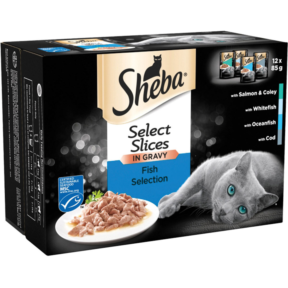 Delight your cat with the irresistible taste of Sheba Select Slices Fish in Gravy Cat Food Pouches 12 x 85g. Each pouch contains a blend of tender fish pieces in a rich, savoury gravy that’s sure to keep your feline friend coming back for more. This variety pack includes pouches of Salmon Coley, Whitefish, Ocean fish, and Cod offering a delicious rotation of flavours. Made with carefully selected ingredients and certified sustainable fish, this wet food is 100% complete and balanced, with no artificial colours or preservatives; just pure, wholesome goodness in every bite.