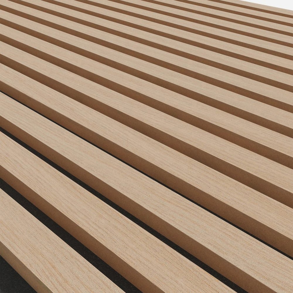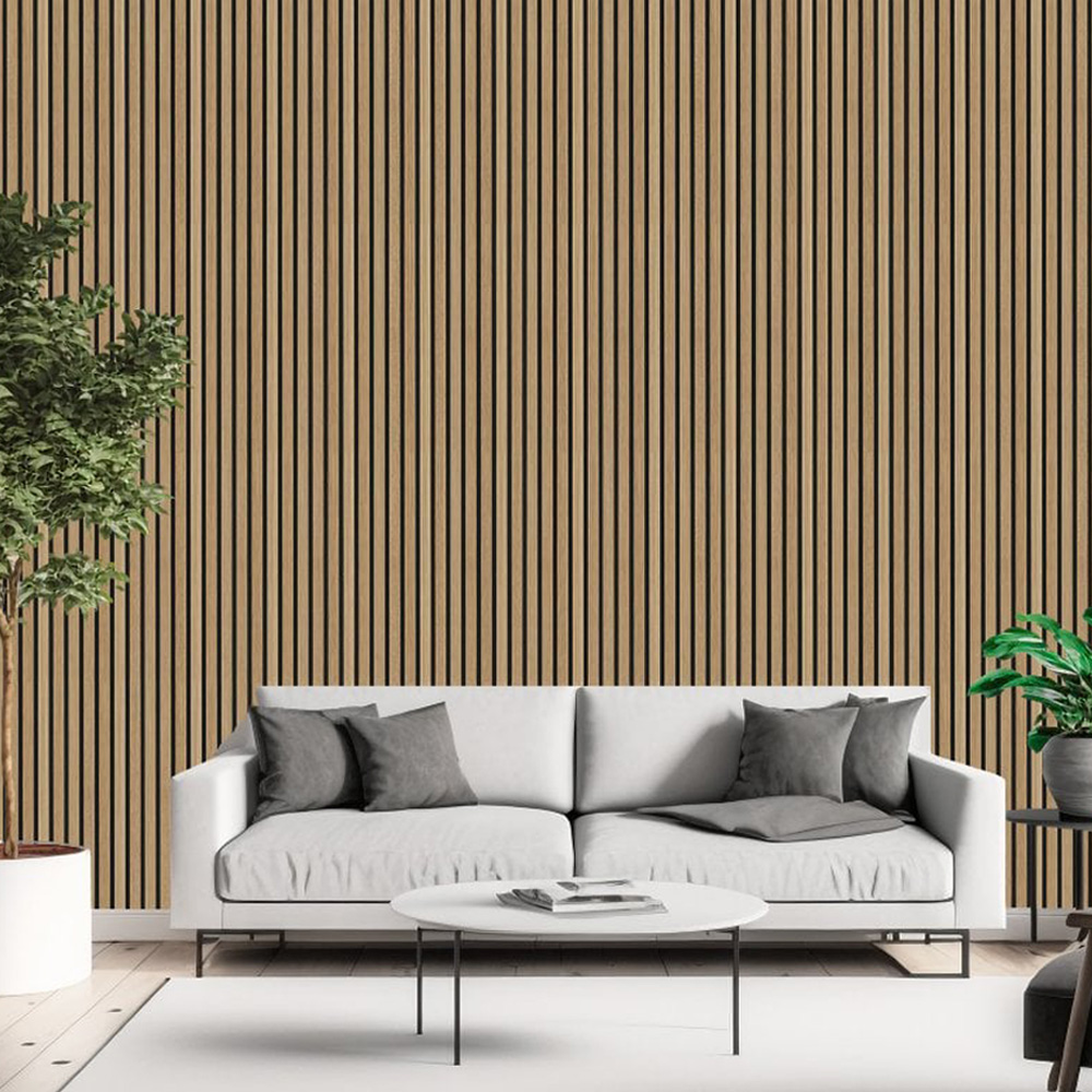 Discover harmonising style and serenity with an Shh Acoustics 240 x 60cm Natural Oak Decorative Shh Acoustics Slat Wall Panel. Crafted with meticulous attention to detail, the three-sided wood veneer slats and black felt backing combine to create a striking statement piece. Experience the soothing effect of reduced echo and improved sound quality in your home office, entertainment area, or any room of your choice. Embrace the beauty of nature and exceptional craftsmanship with this panel.