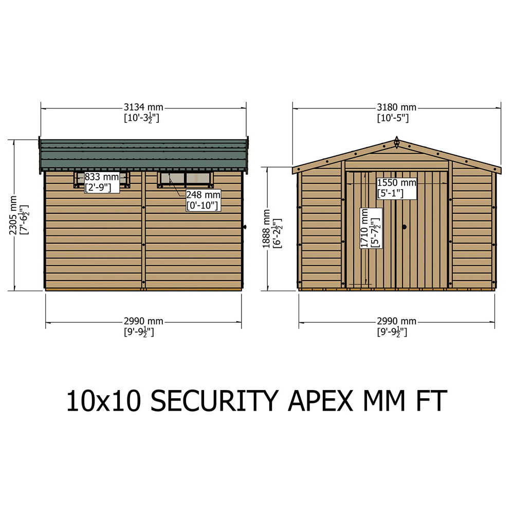 This handmade Security Shed is superb value for money. The shed is supplied with high-quality 12mm shiplap timber to the walls, roof and floor, all on sturdy 44mm square framing. All timber is slow-grown and FSC-approved. The lockable door comes with a full-length security hinge, and the small, high-level windows are fixed. Doors and window frames are pre-hung for easy assembly, and the door can go at either end. The Security Shed comes with a base coat preservative ready for you to top coat after assembly. All necessary fixings and mineral roof felt are supplied. The shed comes flat-packed with a full set of installation instructions. The dimensions shown are for the exterior wall of the building. (Imperial measurements are rounded, so please refer to the metric sizes for accuracy).Note: Currently, we're unable to deliver this product to DG, TD, KA, ML, EH, G, PA, FK, KY, PH, DD, AB IV and KW areas. We regret the inconvenience and will keep you posted when it's available to order for the mentioned postcodes.