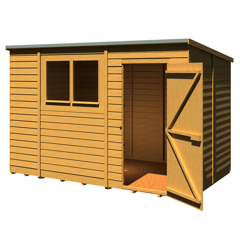 This 10 x 6ft Overlap Pent Shed from Shire offers a very practical design. It is manufactured from high-grade, slow-grown, FSC-approved, North European pine overlap cladding boards over sturdy 34mm square framing. The door is fitted with a pad bolt ready for your own padlock. Plus, both the roof and floor are constructed from solid sheet OSB and two fixed acrylic windows are included. The building is dip treated with a basecoat ready for top coating by you immediately after assembly which can be either a wood stain or a colourful wood paint. All fixings, mineral roof felt and assembly instructions are provided. Note: Before you assemble your building, you will need a base which is flat and level to a sufficient size. Grass, soil or gravel are not sufficient as they will move with the weight of a building. Imperial dimensions are approximate to the nearest foot, please refer to the exact metric dimensions given.Note: Currently, we're unable to deliver this product to DG, TD, KA, ML, EH, G, PA, FK, KY, PH, DD, AB IV and KW areas. We regret the inconvenience and will keep you posted when it's available to order for the mentioned postcodes.